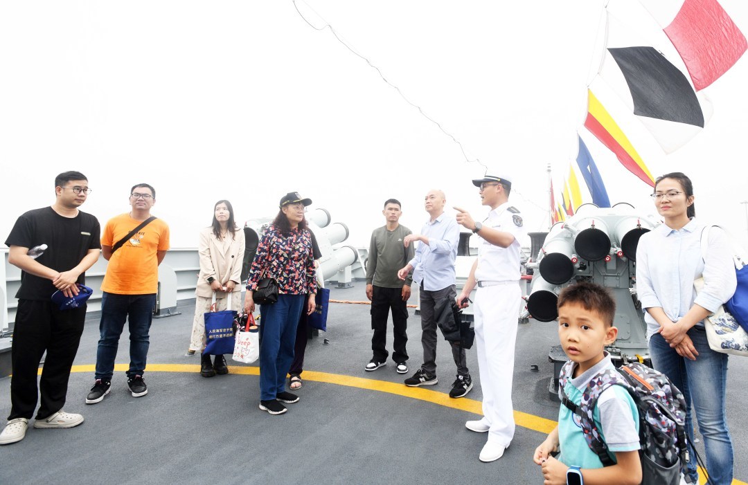 大家在讲解员的引导下,有序参观两艘舰艇。他们爬舷梯、登甲板,一路走、一路看、一路问,近距离感受到了海军官兵的工作、生活等情况。在码头区域,不少市民群众在留影区与两艘战舰合影留念,还有一些小朋友在互动区域体验特色旗语、打绳结等海军特色科目。