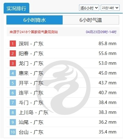 4月18日以来,南方强降雨带南落至江南南部、华南一带,导致这里持续遭遇强降雨、强对流天气侵袭。其中,广东成了强降雨的重灾区。今天08时至14时,广东包揽全国降水排行榜前十,深圳6小时降水量高达85.8毫米,位居第一。