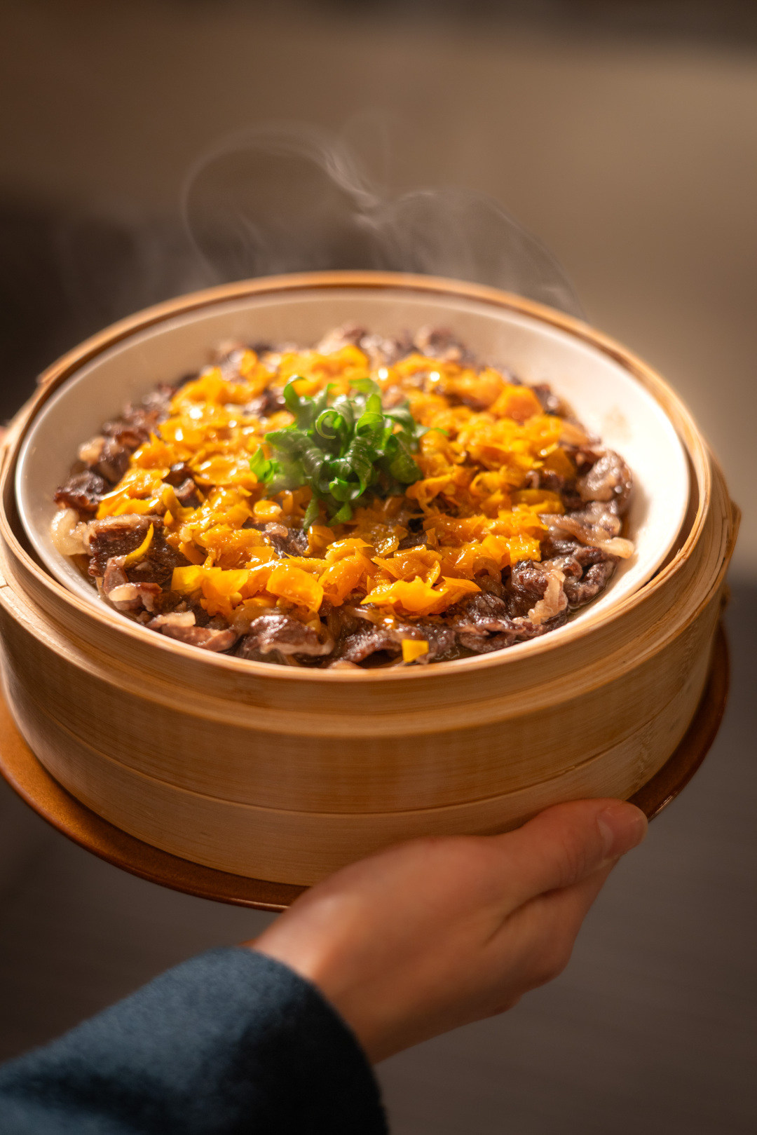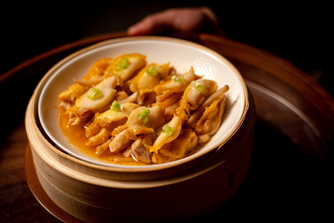 与香椿形成鲜明对比的,是绿豆芽的纯净口感。春夏之交,绿豆芽迎来生长高峰期,出落得更为多汁鲜嫩。别看小小绿豆芽,处理起来可费一番劲儿,更是考验着粤菜师傅的技能。谢师傅说,每日,他们要对绿豆芽一条条进行精选,手工摘除豆芽尾部,留下嫩脆、白净的那部分,当日摘,当日用。那股新鲜劲儿,只有尝过的人方知。炒豆芽考验师傅的手速以及对火候的掌控力。炒久了,豆芽出水,干瘪瘪令人毫无食欲,炒不熟,那半生熟的味也不好受。谢师傅用它来做“咸鱼茸鸡丝炒绿豆芽”,先将豆芽炒至断生,搁置一边;再放鸡丝、切粒的梅香马友咸鱼兜炒,最后加入豆芽一兜即可。这鸡丝,用的是清远麻鸡的鸡腿肉以及部分背部肉。一鸡可多用,其余的部分,手工去骨斩块,再与大连鲜鲍与均安头菜一同蒸制,入口咸鲜可口。