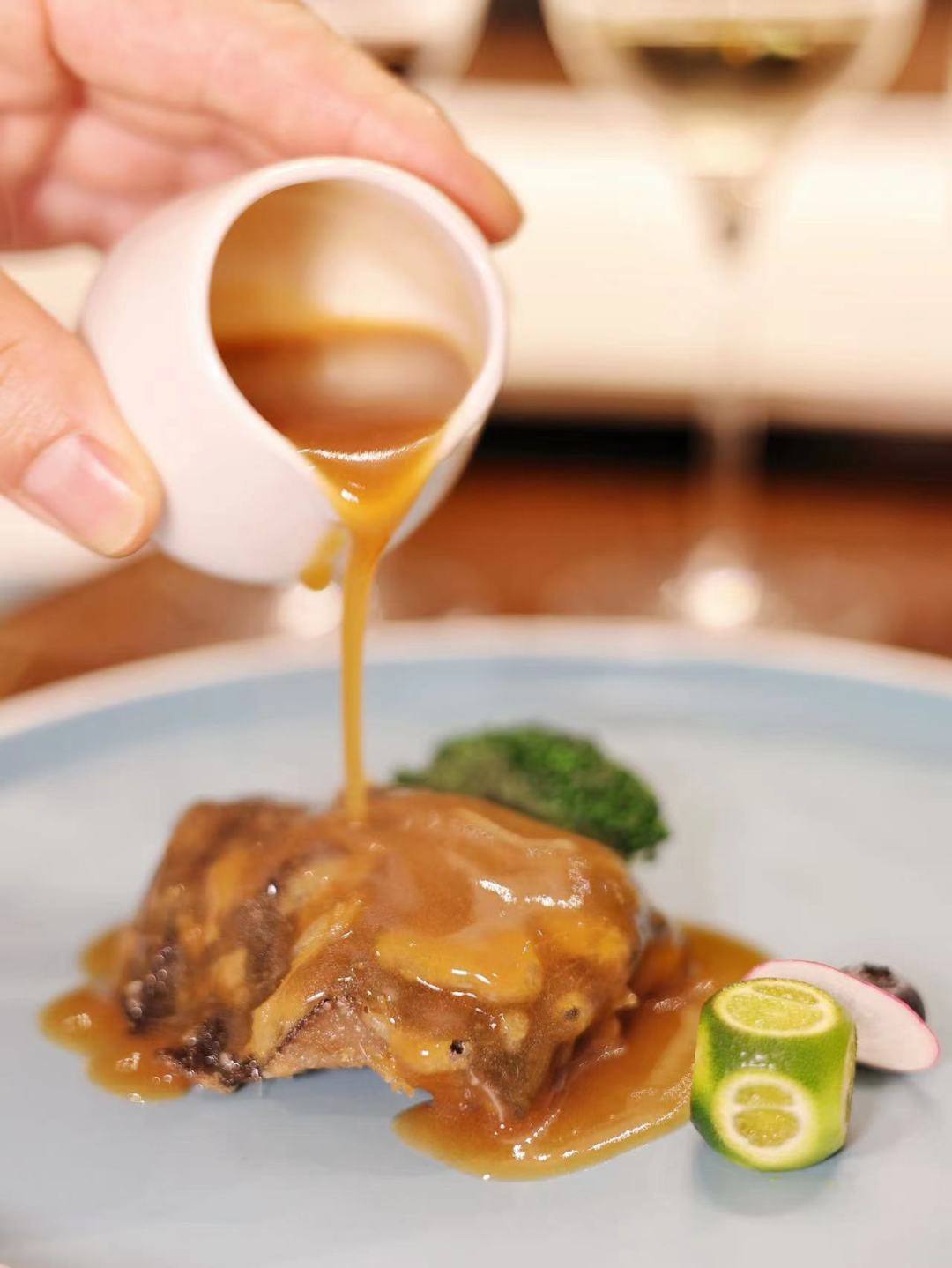 春天的清新,一部分是时令食材带来,一部分源于清新风味的酱汁。贡椒酱、醋椒都是厨师团队的春天“作品”。贡椒酱是选取湖南的黄贡椒,用盐发酵数个小时,待其软化后,放油、蒜炼制调味,风味微辣,最多用3天就要重制。此次,谢师傅用它来蒸潮汕牛肉吊龙部位,颇为开胃鲜美;醋椒是用醋加红椒、青椒末与柠檬调味,酸甜而开胃。用它来浸鲜花胶,做成餐前冷菜,酸甜清爽,毫无负担。