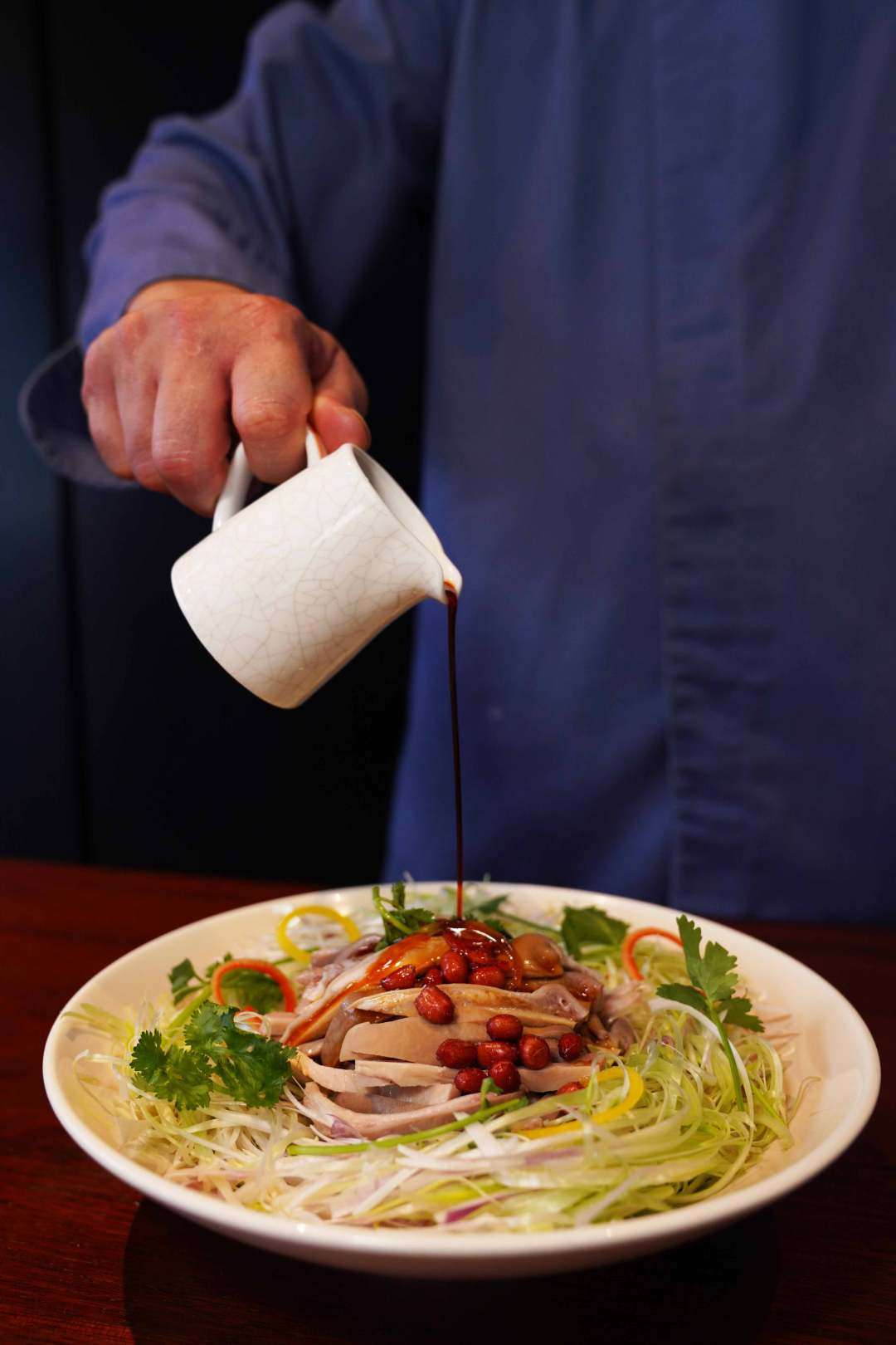 从化此时盛产石榴等,马师傅便用石榴、木瓜等爽口的南方水果,撒上南姜和话梅粉来做“水果捞”,以其作为味蕾打开的“敲门砖”。水东芥菜捞起鲜支竹、香葱捞山泉水冰镇猪肚尖、红蜜柚捞起手撕蹄花,都充分运用了当地食材。支竹乃用从化的农家鲜支竹,取其豆香味浓郁、嫩滑,水东芥菜则爽甜,二者达成口感上的互补。从化当地的土猪菜肴花样亦不少,本地猪的猪肚之上,取那爽脆、具有一定厚度的猪肚尖,这个部位在整个猪肚中只占了3成。用胡椒做底味,烹熟后冰镇处理,别看它貌不惊人,却是爽脆而开胃,是胡椒给了它那劲儿;猪手可做成捞起手撕蹄花,用白云猪手的处理方式,给予其酸辣味,配上爆汁口感的蜜柚,组合新奇。
