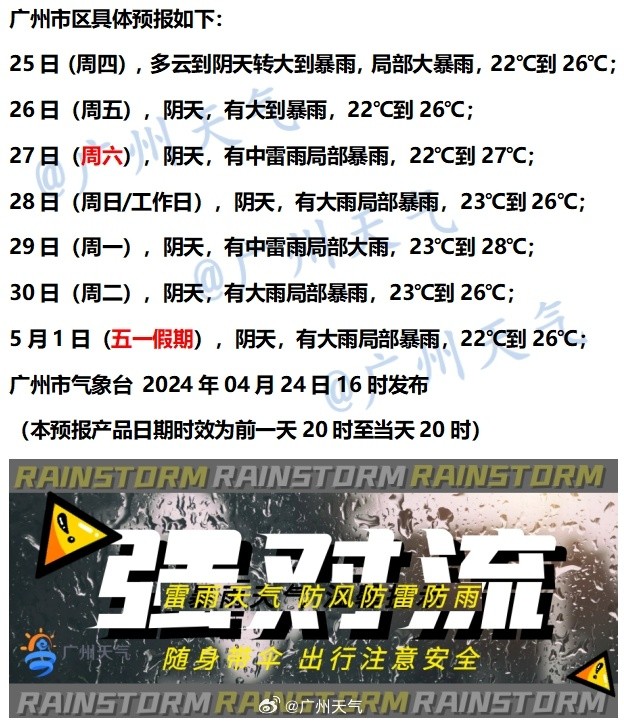 广州4月25日至26日有大到暴雨局部大暴雨,并伴有8~9级瞬时大风和强雷电。降水集中时段为4月25日白天、26日凌晨至上午。过程累积雨量:80~120毫米,局部150~180毫米;最大小时雨强30~50毫米,局部60~80毫米。展望4月27日~30日广州雷雨仍频繁,间中雨势较强。4月25日早晨的降水或与上班、上学高峰期叠加,有可能发布暴雨和雷雨大风预警信号,大家明早出门前记得关注最新天气情况。