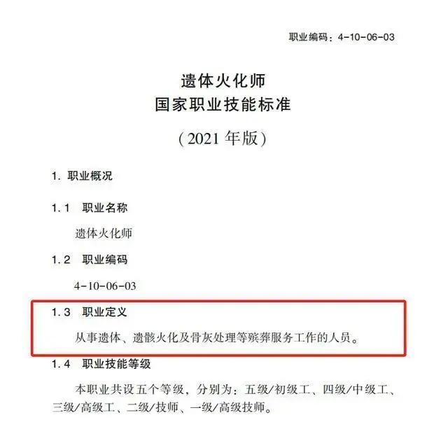 2021年11月,人社部办公厅、民政部办公厅联合发布殡仪服务员、遗体防腐整容师、遗体火化师等5个国家职业技能标准。根据该标准文件,遗体火化师是指从事遗体、遗骸火化及骨灰处理等殡葬服务工作的人员。