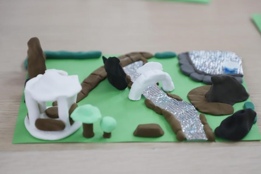药洲园林自在古雅的意境也激发了少儿读者的创作灵感。户外研学结束后,小读者们返回省立中山图书馆少儿部进一步拓展探究药洲之文化趣闻,并以药洲为参考雏形,设计打造创意园林景观。红墙朱瓦、怪石嶙峋,配以婆娑树荫,少儿读者以湖、亭、石、桥为主要创作元素,设计出的景观既体现了岭南园林的清静幽雅和精致秀丽,又与岭南人求实兼蓄、追求艺术性和实用性的风俗文化相得益彰,别具特色。