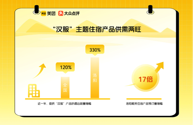 此外,洛阳有着深厚的历史文化底蕴和火热的汉服消费氛围,“汉服酒店”也彰显着城市特色。美团、大众点评数据显示,2024年以来,洛阳“汉服”搜索量位居全国前茅,“男士汉服”搜索量更是同比增长550%,不少游客会专程来洛阳体验汉服。