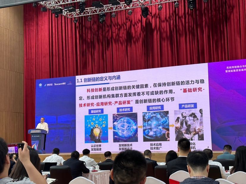 南航集团总经理韩文胜在致辞时表示,南航在国务院国资委和民航局的领导下,在科技创新生态伙伴的支持下,以创新链为核心,充分发挥产业链的带动作用,推动资金链和人才链优化配置,希望通过举办本次大会,与政府领导、企业家、专家学者共同探讨进一步推动民航领域“四链融合”。