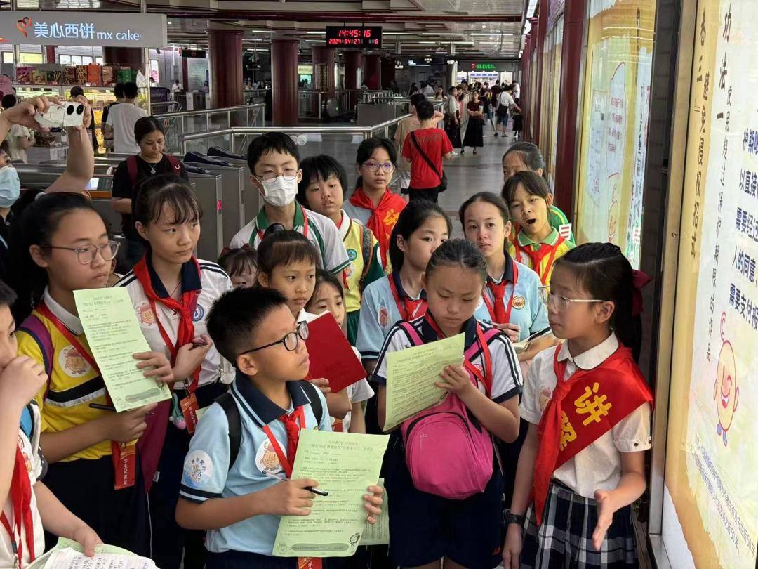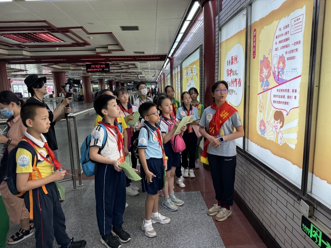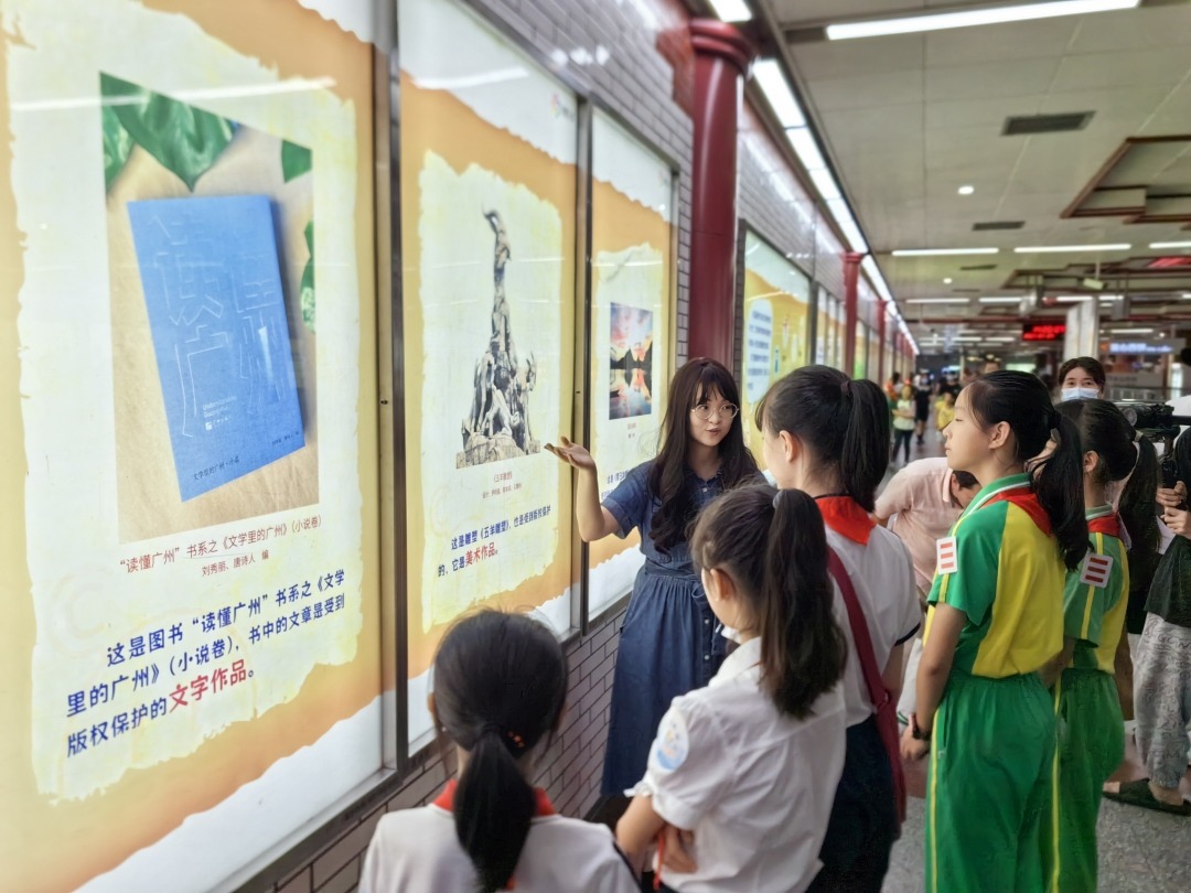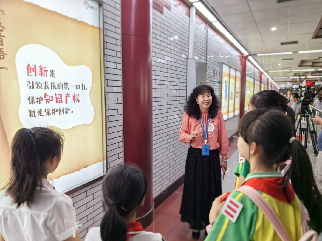 广州市版权保护中心和广州少年儿童图书馆的工作人员化身版权保护“法师”,带领孩子们在地铁站参观“版权保护秘籍——版权伴书香”展览,开启三卷版权保护“秘籍”。曾经获得“版权小达人”的同学还为同行的小记者介绍版权知识。参加研学的孩子们在有趣轻松的氛围中学习版权法律知识,了解图书馆,了解版权如何守护阅读、保护创意和创新。