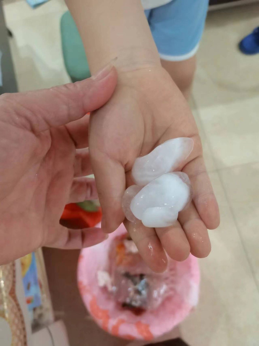 增城朱村街居民小林展示冰雹。