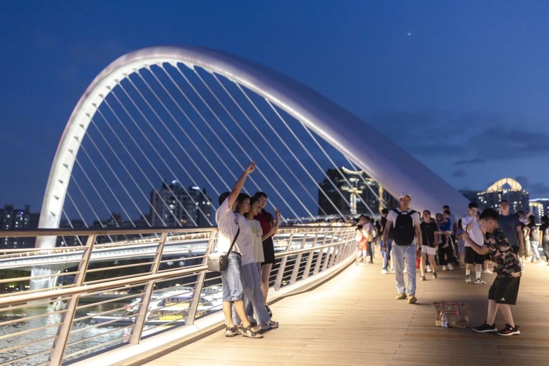 横跨珠江两岸的桥梁有很多,但荣获“世界人行桥”金奖,目前世界上跨度最大,宽度最宽的曲樑斜拱人行桥,就只有这座“海心桥”。