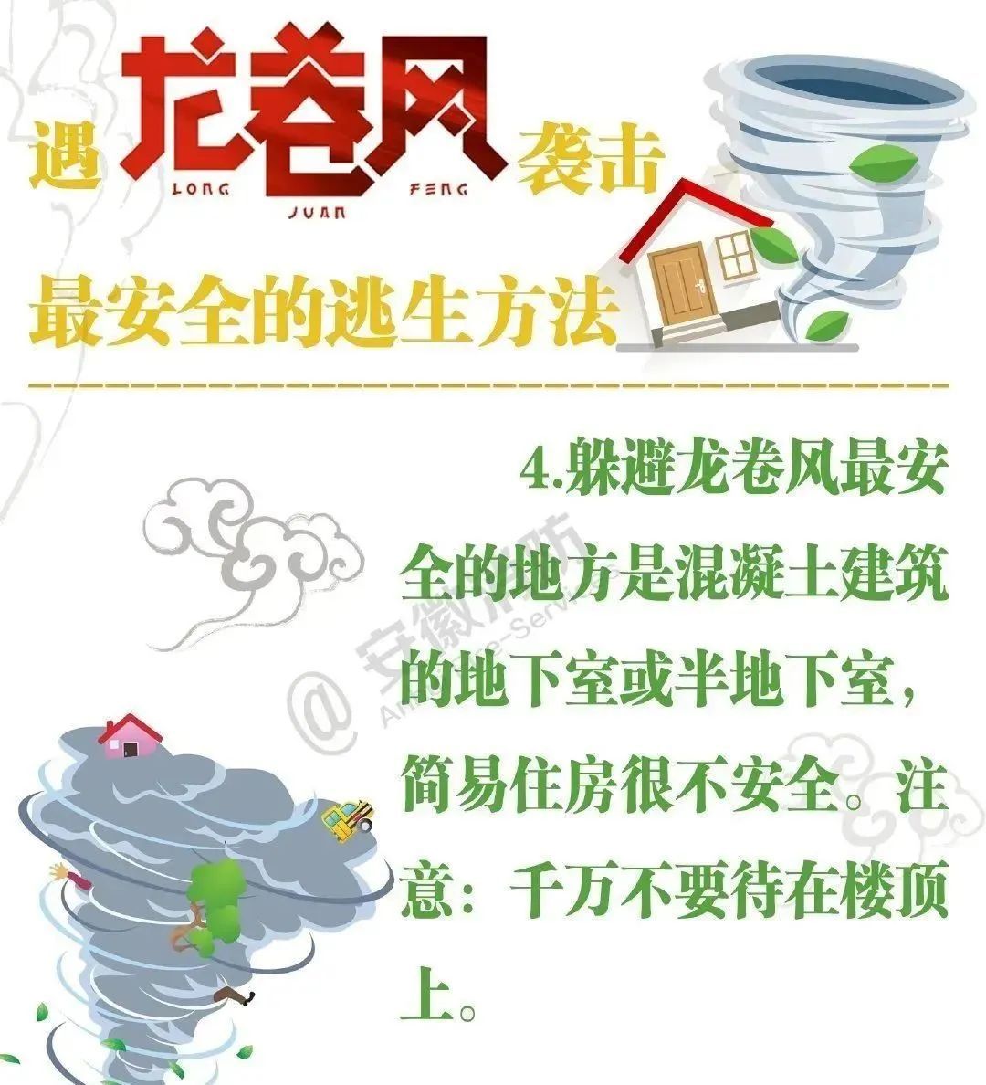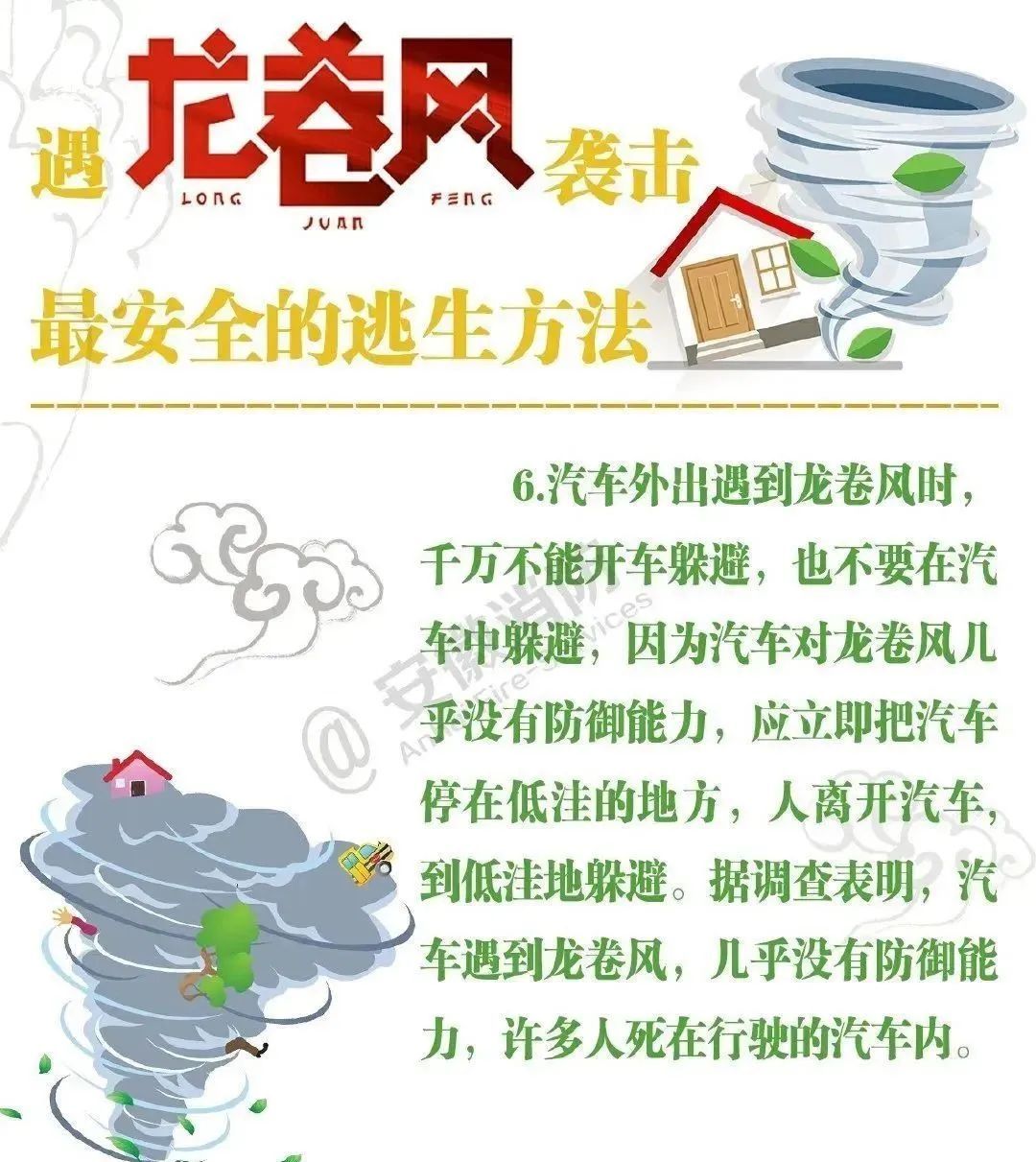 ③在野外遇龙卷风时,应就近寻找低洼地伏于地面,但要远离大树、电线杆、广告牌、围墙等,以免被砸、被压或发生触电事故;