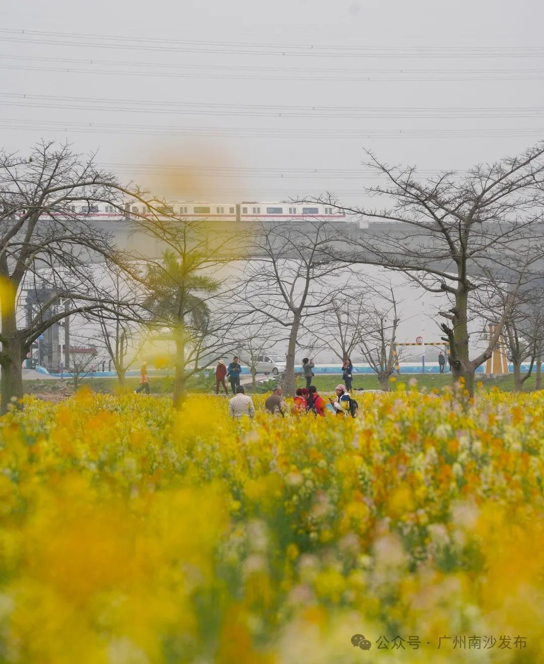 在东涌沙湾水道,河岸的彩绘与青绿的田野、远处的房屋相映成趣,地铁四号线不时从高架桥上经过,点缀风景。花海盛放时,满目皆春,宫崎骏的动漫在这一刻具象化。