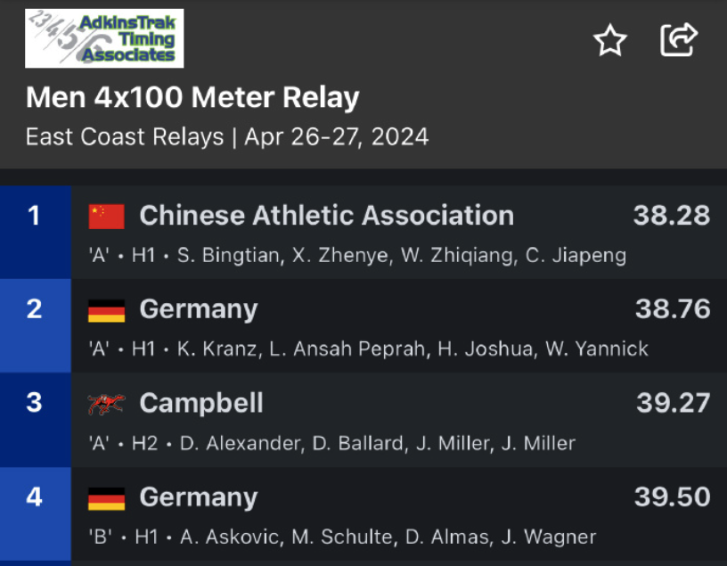 北京时间2024年4月28日,正在美国外训的中国田径队传来喜讯,在美国佛罗里达东海岸接力赛中,被分在国际组的中国队在男子4✖️100米接力中,以38.28秒的成绩获得冠军。这也是中国队百米接力的赛季最佳,值得一提的是,这一成绩甚至比杭州亚运会夺冠成绩38.29秒还快了0.01秒。