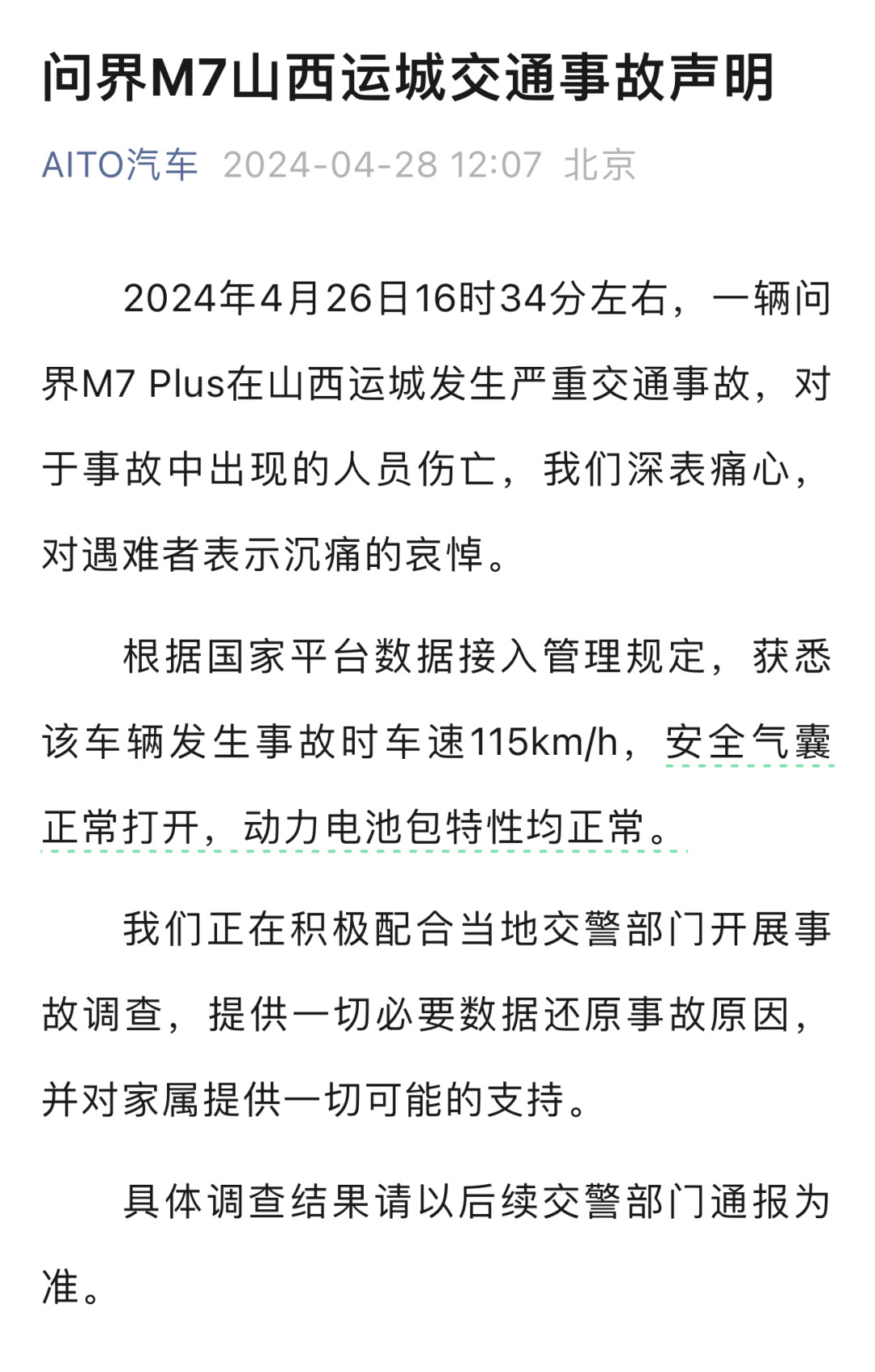4月28日,“AITO汽车”官方公众号发布声明表示,“2024年4月26日16时34分左右,一辆问界M7 Plus在山西运城发生严重交通事故,对于事故中出现的人员伤亡,我们深表痛心,对遇难者表示沉痛的哀悼。