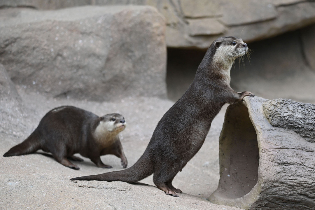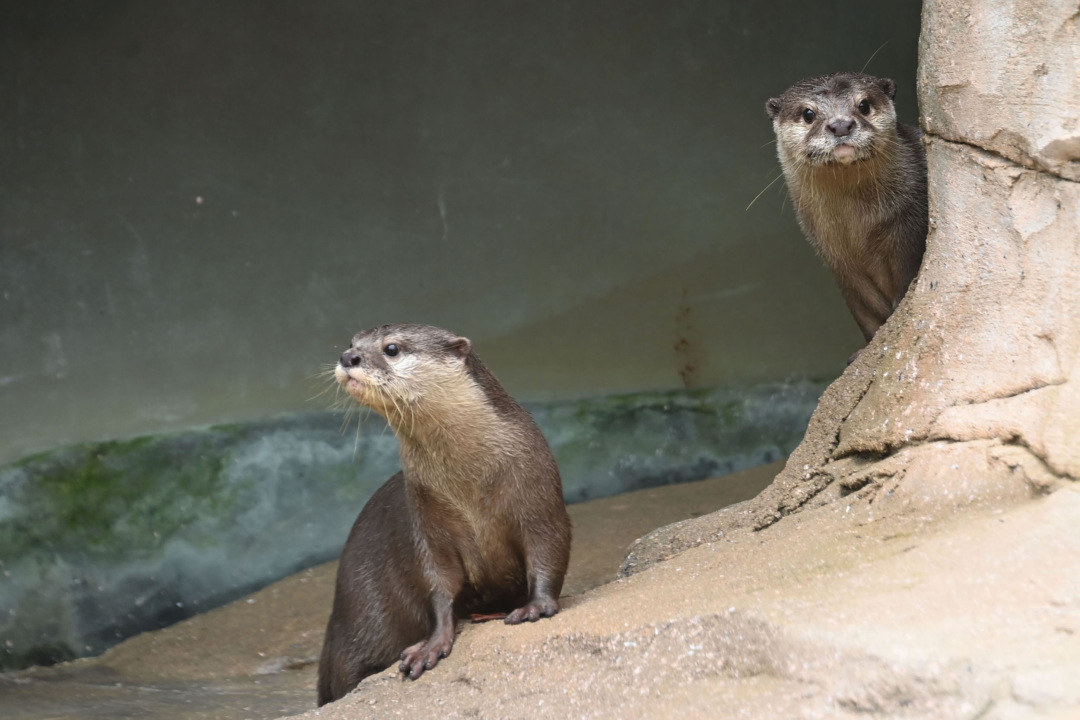 在动物园水獭馆看到,随着饲养员拉开室内笼舍门,水獭从墙边探出小头张望,迅速又躲了起来,反复多次,萌态十足。水獭经过一番察看,不慌不忙地走到室外运动场,它们对新家园的水池、爬架、洞穴等供它们玩耍的物体都充满好奇。灵巧的后肢一踩迅速站立起来,瞬间做出观看的动作,行为反应敏锐,相互接触,仿佛传递属于它们的“信息”,尽情展示它们的灵活和友好。