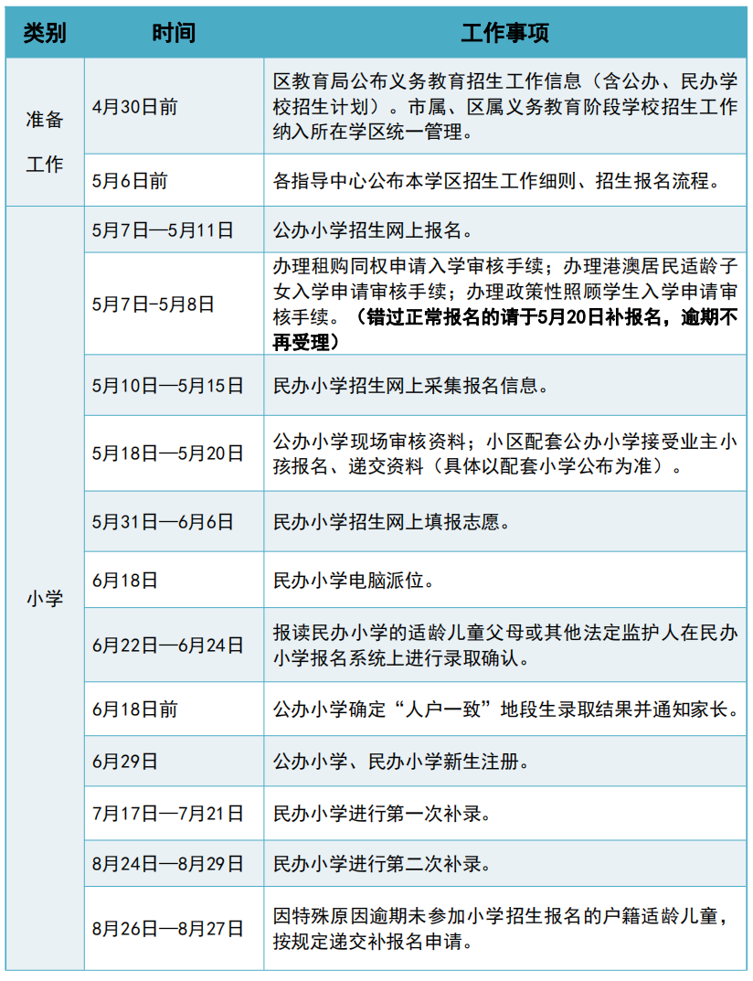 (二)5月7日-5月8日,租购同权学生、广州市政策性照顾借读生及港澳居民适龄子女向居住地教育指导中心申请入读小学一年级(错过正常报名的请于5月20日补报名,逾期不再受理)。