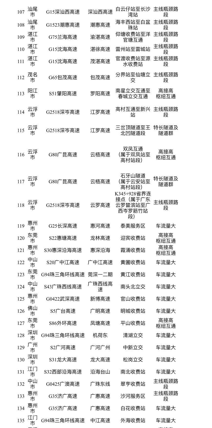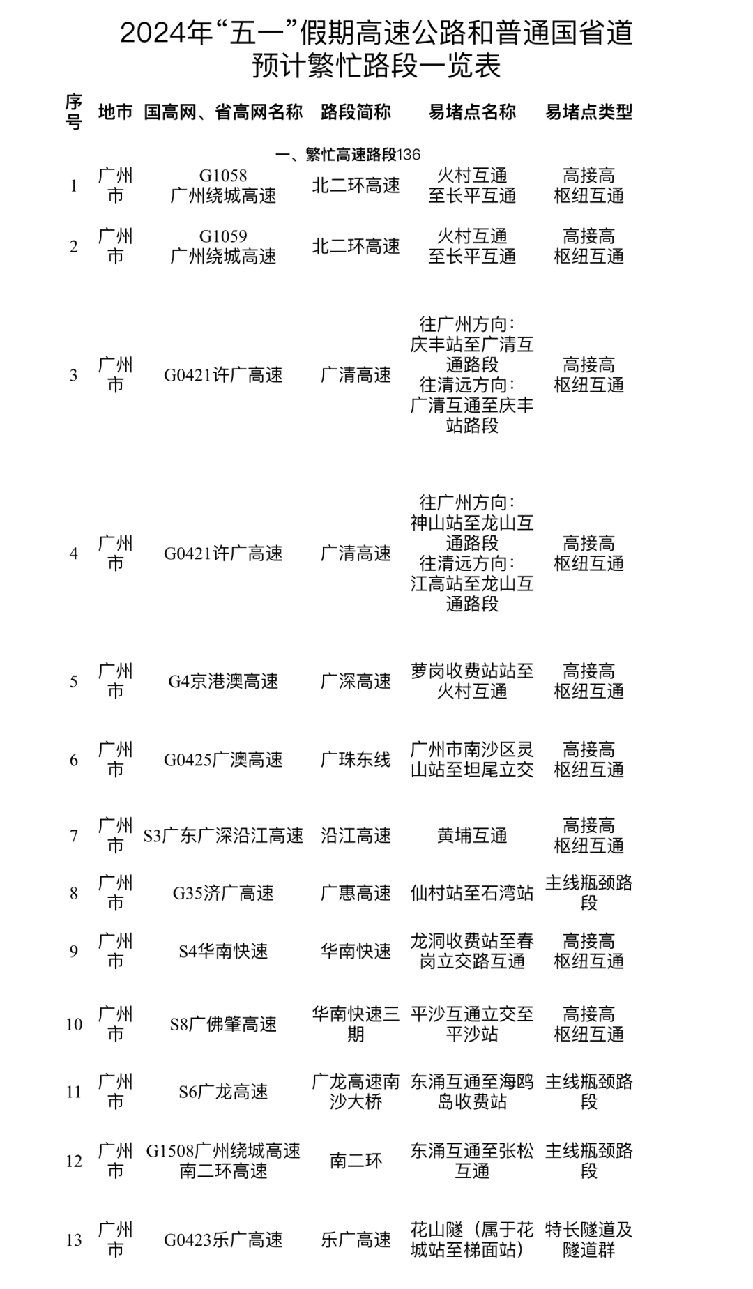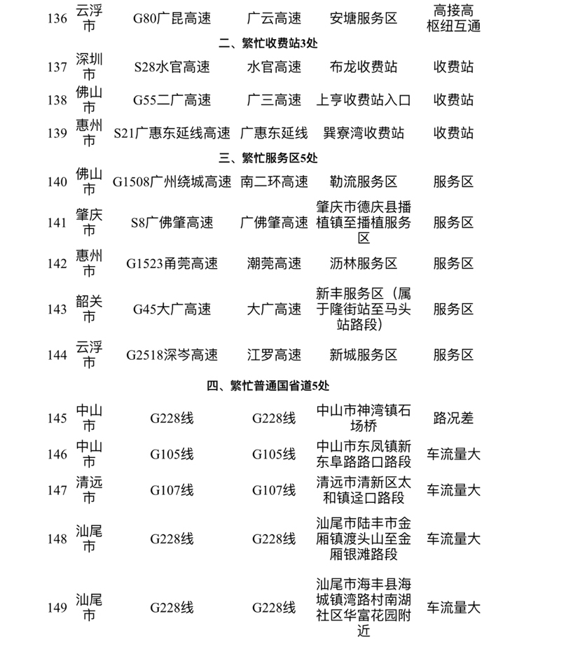 今年“五一”假期,预计全省公路易堵点位共计149处,其中高速公路易堵路段136处,易堵服务区5处,易堵收费站3处,普通国省道易堵点位5处。