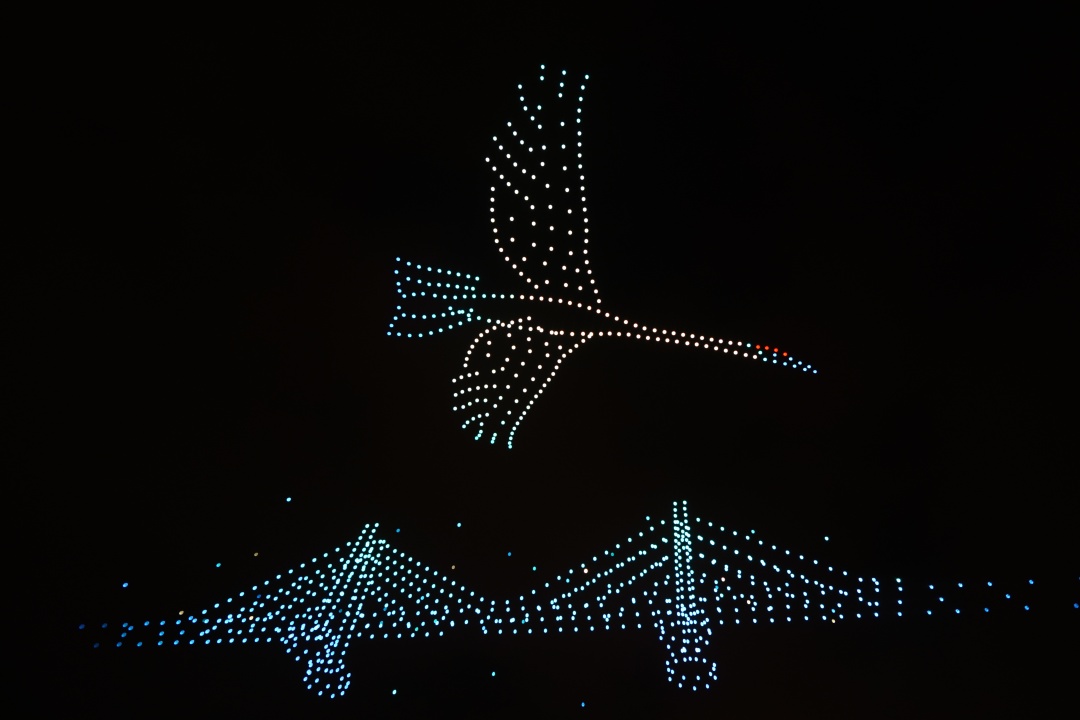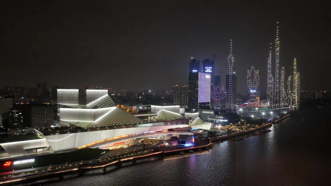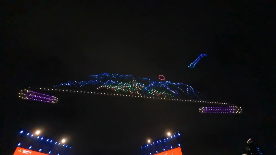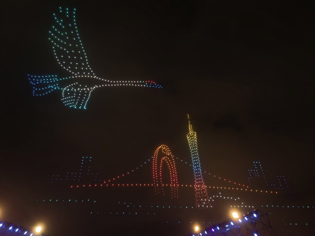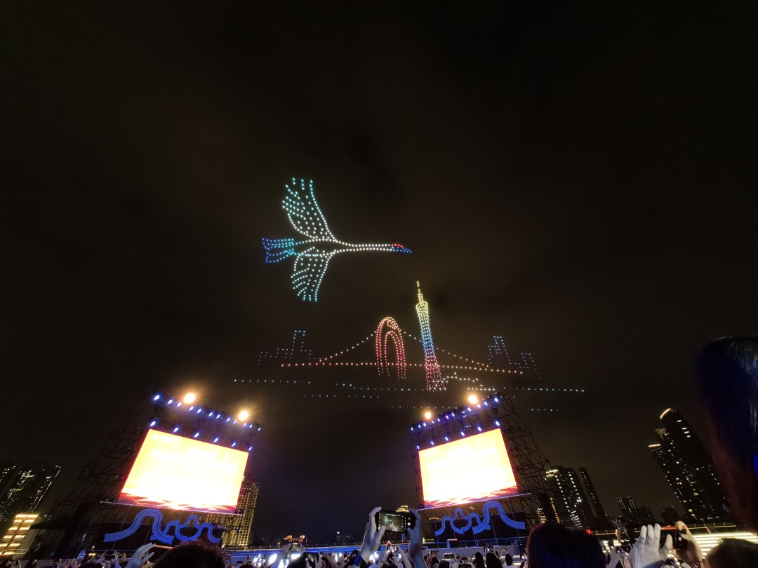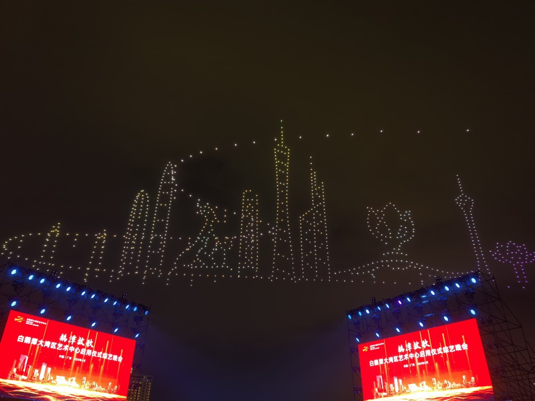 21:20,令人炫目的无人机表演开始,一只无人机组成的白天鹅腾空飞起。之后15分钟里,1000架无人机在夜空中盘旋穿梭,不断变换着图案,粤剧、岭南画派、港珠澳大桥、白鹅潭大湾区艺术中心等元素一一呈现,以科技的力量带领大家领略鹅潭意境,星河璀璨。现场不时爆发出热烈的喝彩声。