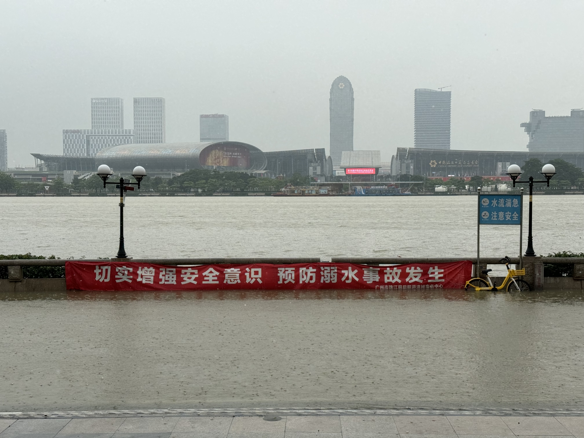 4月28日下午2时30分,天河区风雨大作,记者在位于天河区临江大道的员村亲水平台看到,平台受到江水入侵,已经没过最靠近江边的一层。虽然亲水平台还没有护栏围住,但是已经拉起了警戒线。现场有工作人员执勤,劝离靠近平台的市民。28日11时54分起,天河区雷雨大风黄色预警信号生效,虽然后期升级预警信号可能性较小,但降水持续,珠江口沿岸容易出现倒灌现象,请市民不要到珠江沿岸低洼亲水平台逗留。