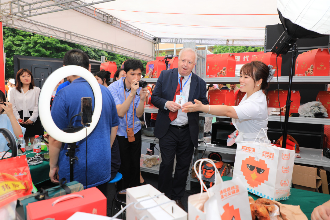 世界技能组织董事会成员、竞赛委员会主席史蒂芬·普拉绍尔参与直播电商互动体验。