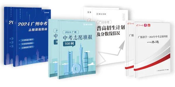《2024广州中考志愿填报指南》*1份、《2023广州普高招生计划及分数线手册》*1份、《2024广州中考志愿填报100问》*1份、《广报求学·2024中考志愿填报一本通》*1份。