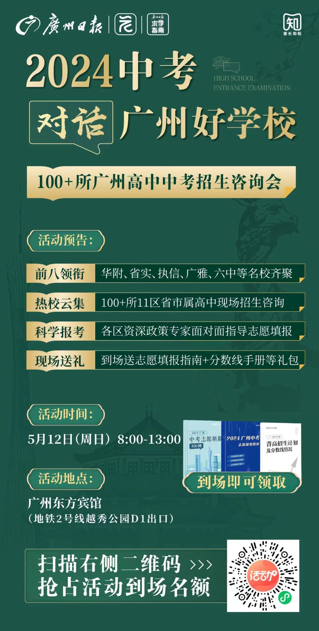 在志愿填报即将到来之际,为了帮助应届广州中考家庭规划好填报策略,并且一次性获取所有学校的招生信息,广州日报将联合“家长知校”在5月12日邀请超过100所高中阶段学校的招生负责人举办广州优质高中阶段学校大型咨询会。