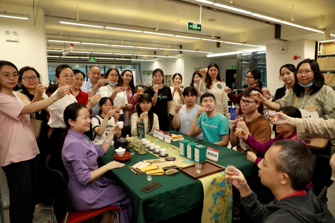 随后,她以专业的视角和生动的语言,为大家详细介绍了春茶的种植、采摘、制作等过程。听到介绍后,不少读者开始迫不及待想要一品春茶。于是关洁婷组织大家来到品茶桌就坐,怡臻原茶文化志愿服务队的茶艺专业志愿者为读者们进行讲解——这些志愿者都是具有10年以上从业经验的资深茶艺专家。