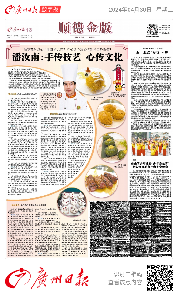 如今,面对越来越多的预制菜、预制面点,广式点心师的价值体现在哪里?人才培育如何发力?从一名学徒成长为优秀的点心大师,广式点心师联谊会常务副会长兼秘书长潘汝南,对广式点心有自己的观察和心得。在他看来,点心作为美食文化的重要组成部分,深受大众喜爱,而点心师的角色至关重要,他们不仅是技艺传承者,更是文化传播者。近日,广州日报全媒体记者与潘汝南展开对话。