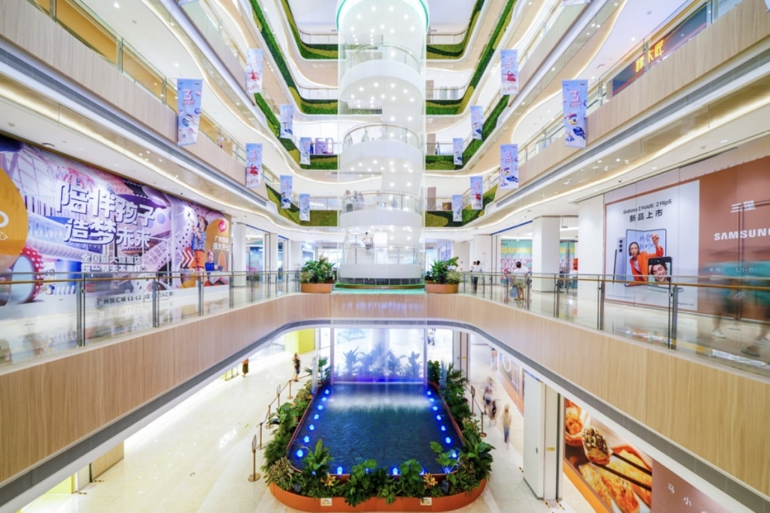 悦汇城在南中庭焕新开辟出珠水长流时光瀑布,将岭南本土文化与年轻人喜爱打卡的氛围感融入场景设计中,塑造室内悠闲的社交打卡新聚点;西门户外夜景灯光焕新,成为广州新晋夜景打卡地;东门户外广场引进火星攀岩、板式网球等运动项目,定制悦汇城“运动公园”城市级名片。