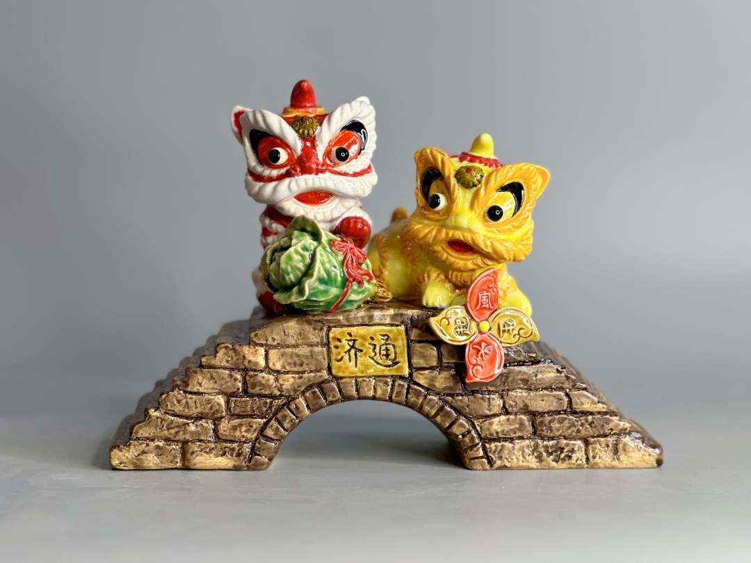 此次新美陶公司推出“石湾故宫四宝”系列、《幸福满载》和《通济桥》三项“首发”陶瓷艺术品。“石湾故宫四宝”是由苏锦伦大师全新演绎两百多年前的“佛山制造”,厚重而富有变化的釉色,返璞归真的格调令人称奇。李义鹏大师精心创作的限量版《幸福满载》,限量25尊,被授予佛山市技能大师工作室的首件新作。《通济桥》取材两只俏皮醒狮,取其“必通而后有济也”之意,两只岭南文化代表小南狮,一只手提生菜,代表生财、财运亨通;另一只手握风车,寓意风生水起、运转乾坤。