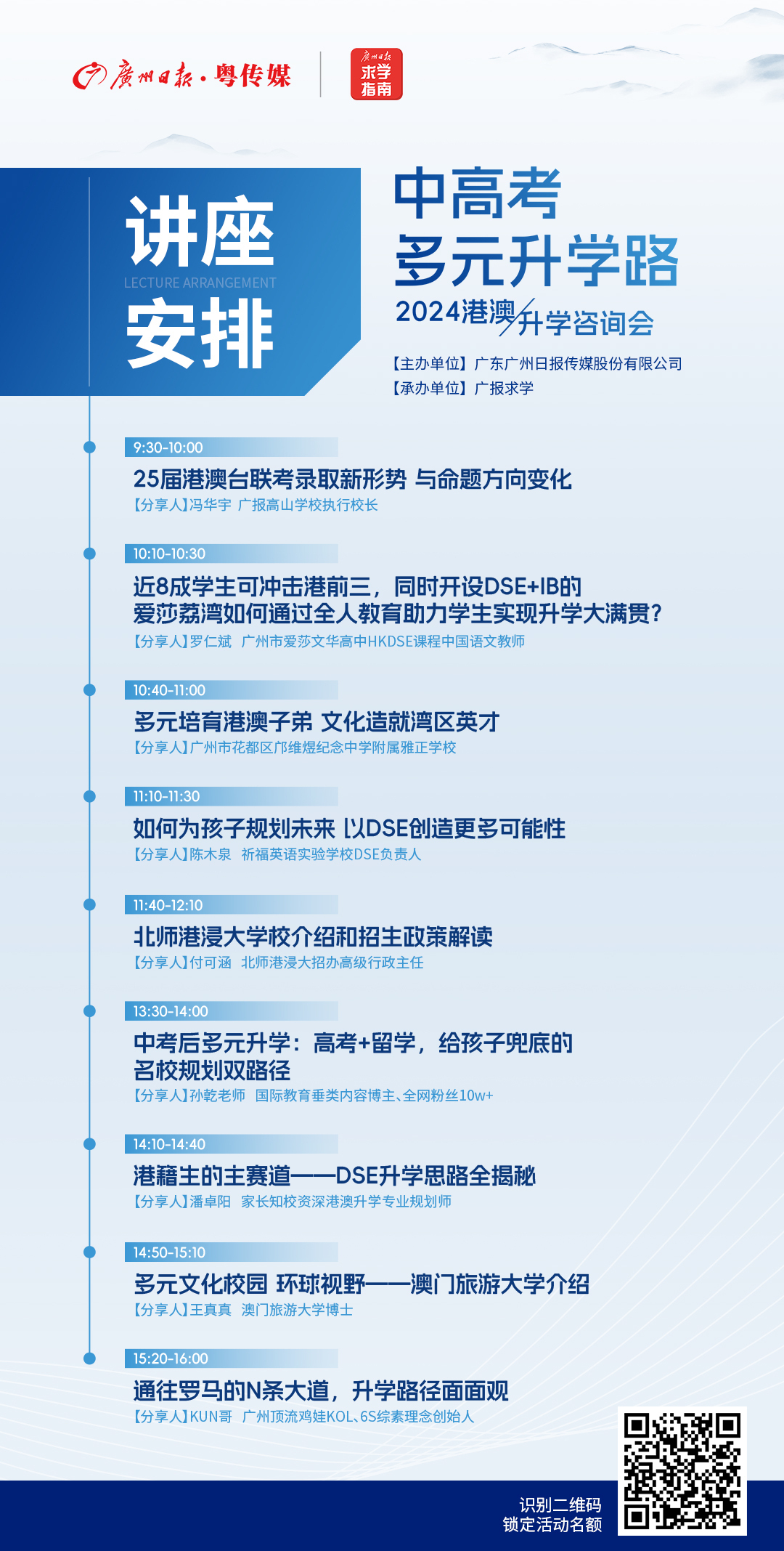 他们分别是:广东华侨中学港澳子弟班、广州市培英中学(鹤洞校区)港澳子弟班、广州市花都区邝维煜纪念中学(雅正校区)港澳子弟班。值得期待的是,3所公办普通高中的“港澳子弟班”均将加盟本次咨询会。