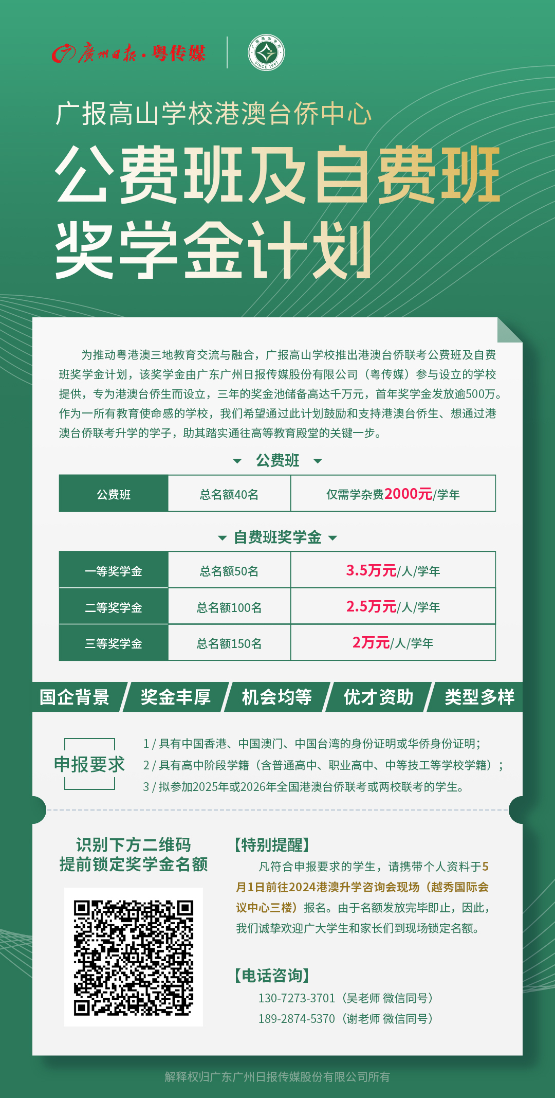 咨询会现场,广报高山学校将重磅启动“港澳台侨联考公费班及自费班奖学金计划”。符合条件的学生通过考试后,成绩优异者直接入读公费班;奖学金由广东广州日报传媒股份有限公司(粤传媒)参与设立的学校提供,面向港澳台侨学生发放,三年的奖金池储备高达千万元,首年奖学金发放逾500万元。