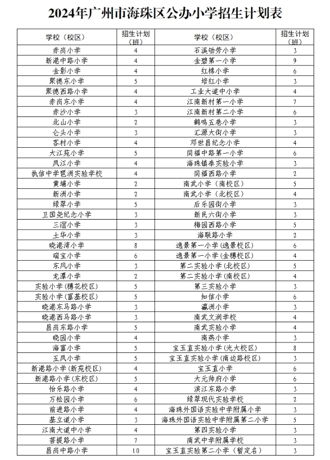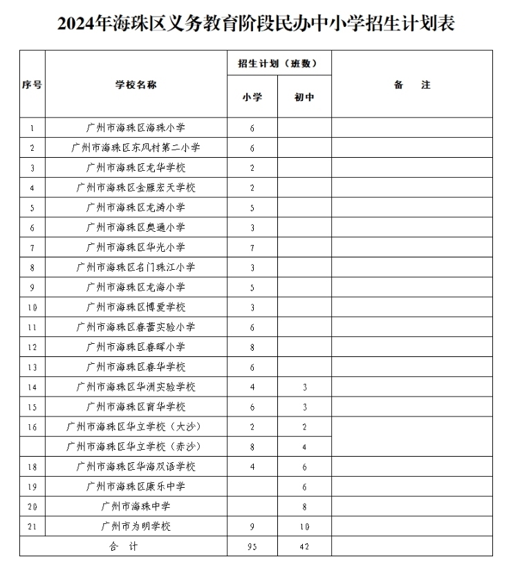 2024年海珠区义务教育阶段民办中小学招生计划表