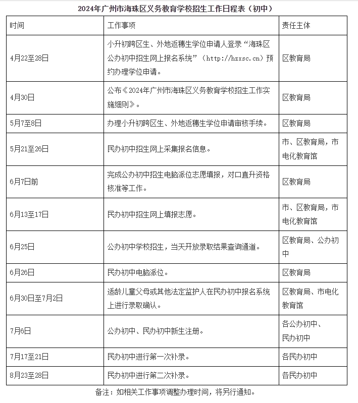 2024年广州市海珠区义务教育学校招生工作日程表(初中)