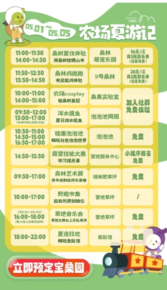 这个五一,宝桑园将开启特别活动“农场夏游记”,农场生活体验、夏日清凉玩水、露营艺术市集、晚间狂欢等项目充实你的假期。