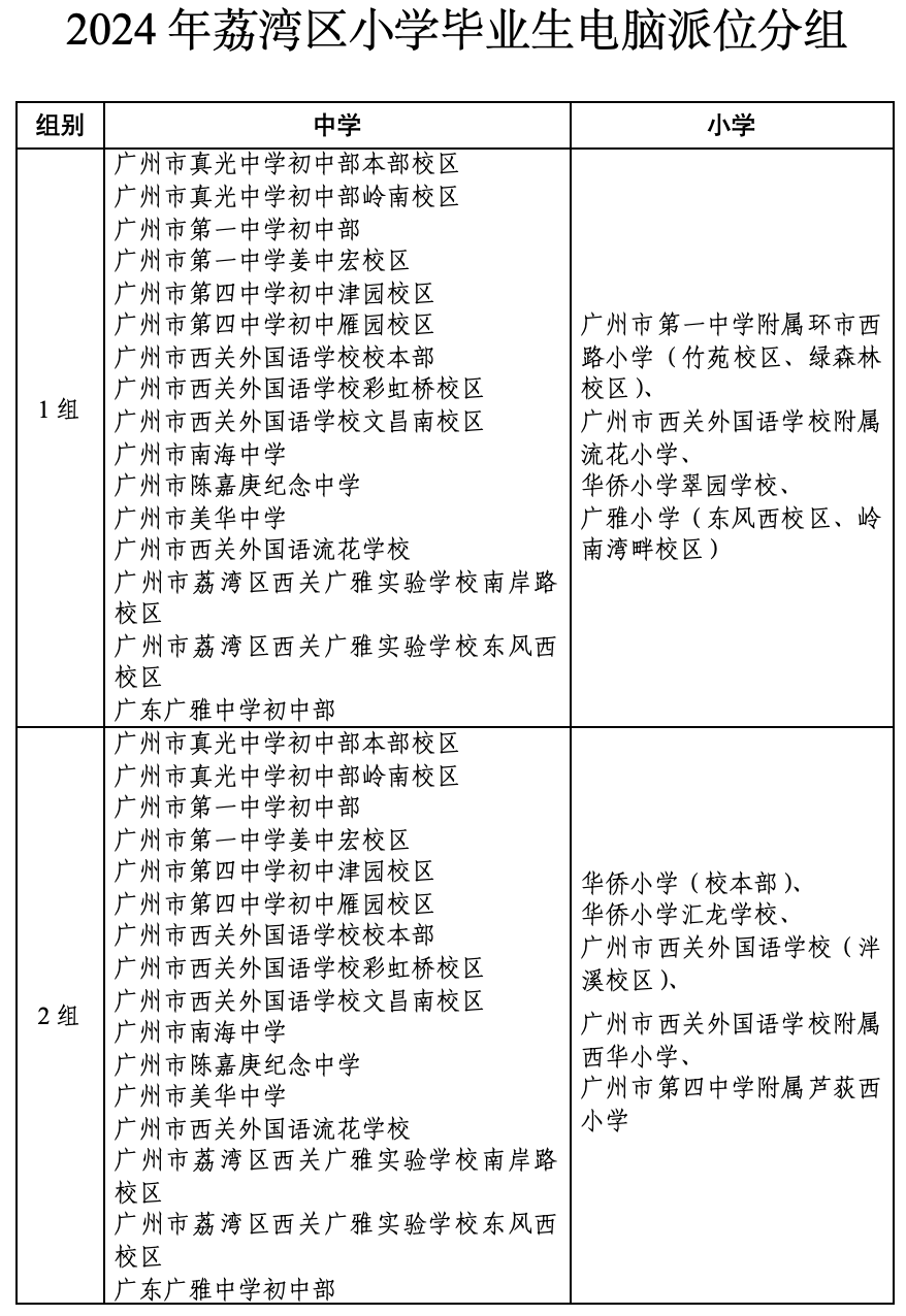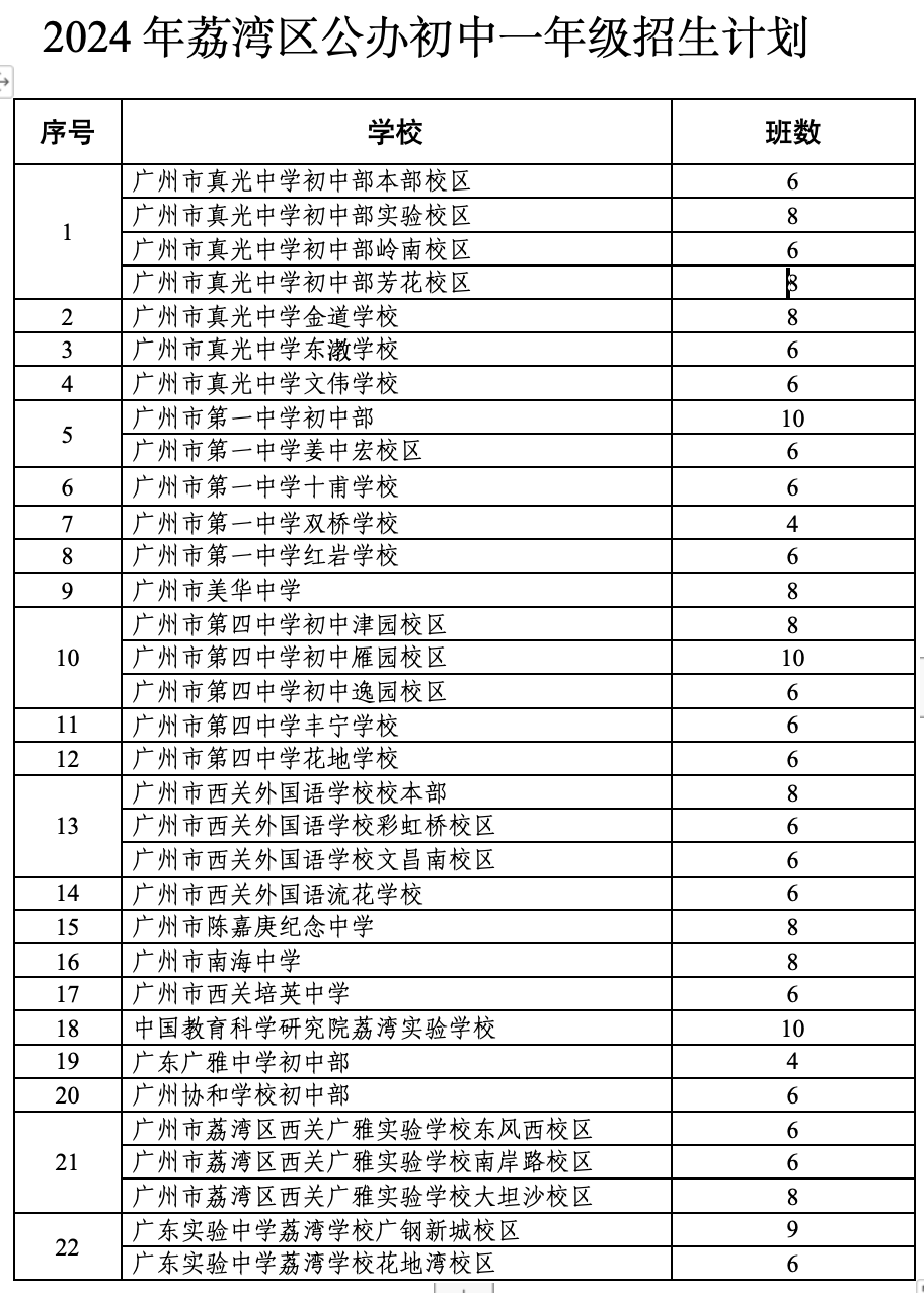 4月30日,广州市荔湾区教育局发布公办初中一年级、公办小学一年级和民办义务教育学校等3份招生工作方案。根据公办初中一年级招生工作方案,相关信息如下: