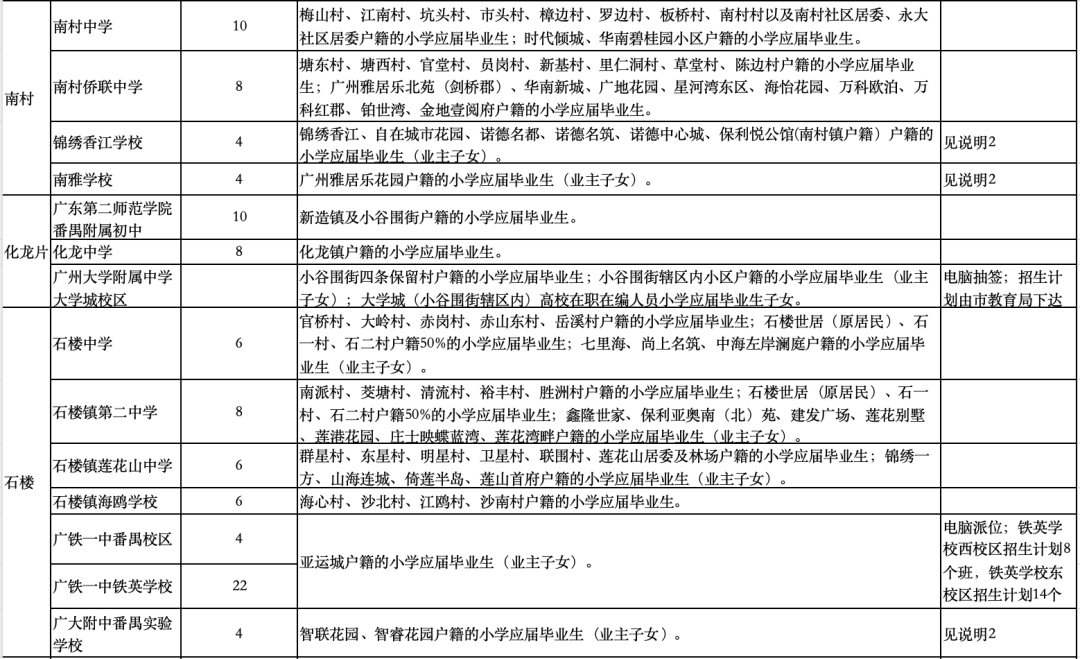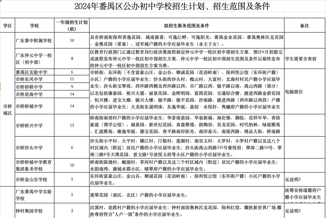 4月30日,广州市番禺区教育局在其微信公众号“广州番禺教育”发布2024年番禺区义务教育阶段学校招生计划、招生地段及条件等信息。2024年番禺区公办初中学校招生计划、招生范围及条件如下: