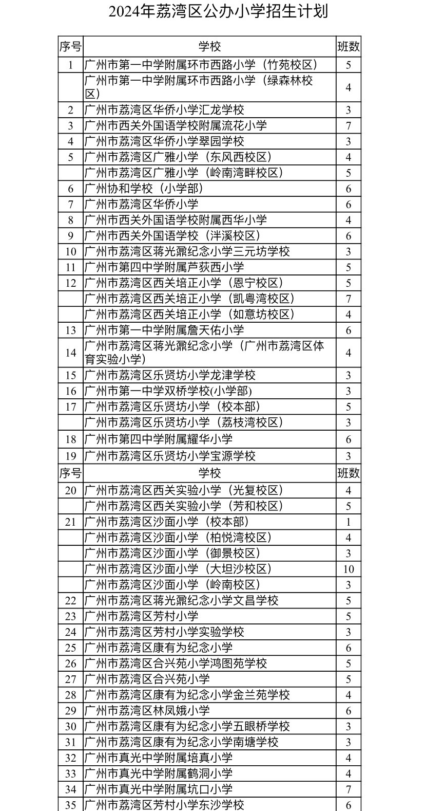 4月30日,广州荔湾区发布2024年广州市荔湾区公办小学一年级招生工作方案,公布2024年荔湾区公办小学招生计划、2024年荔湾区公办小学适龄儿童入学登记服务地段划分表(http://www.lw.gov.cn/attachment/7/7596/7596991/9628489.docx),家长请留意报名节点和相关信息。