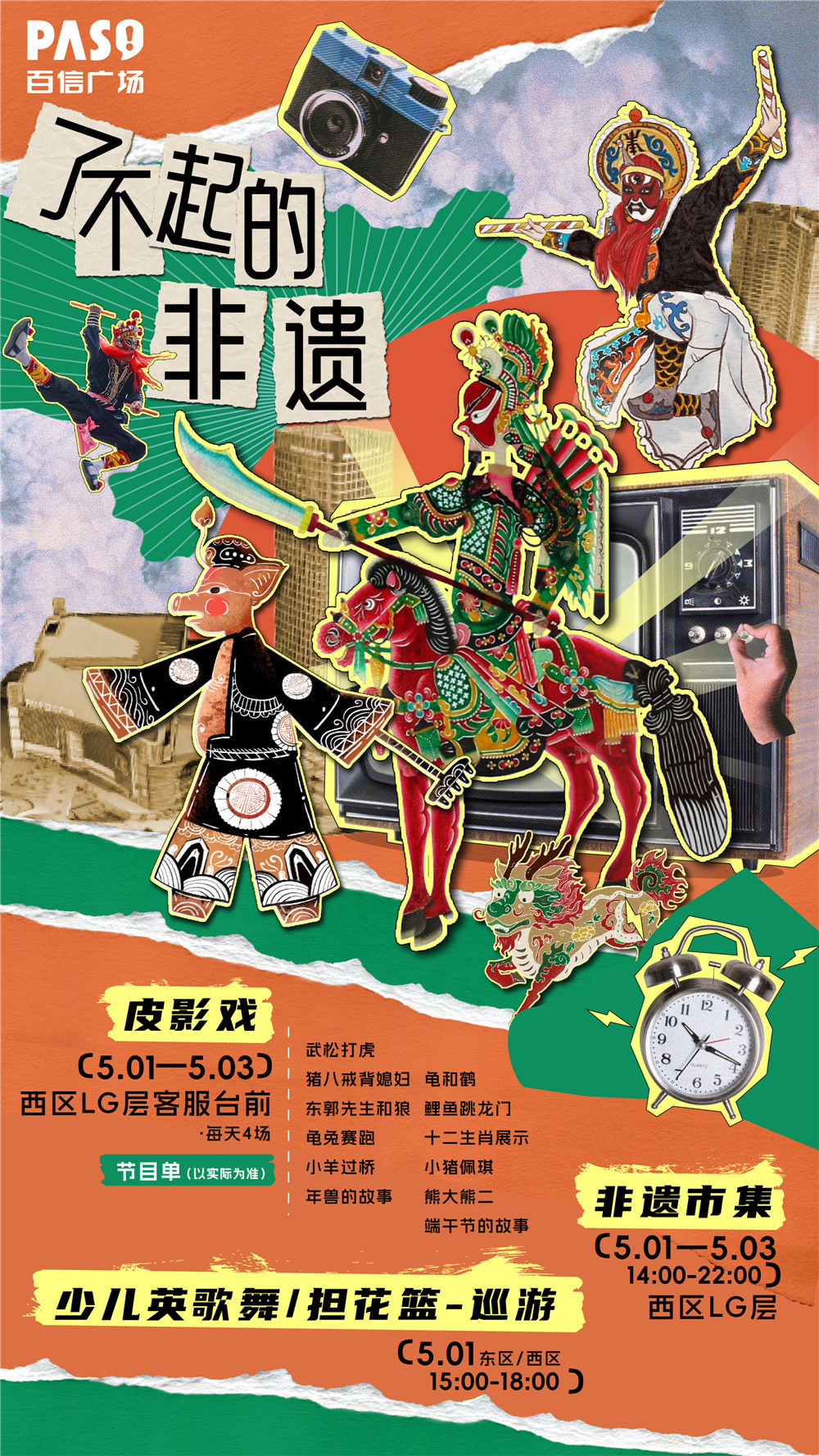 “五一”假期,百信广场将连续三天举办非遗文化体验活动。其中,5月1日举行少儿英歌舞、潮汕担花篮巡游表演,5月1日至5月3日举办非遗文化市集,让市民亲身体验剪纸、花灯、扎染、油纸伞绘画、陶土拉胚、纸鸢手作等非遗制作技艺。5月1日至5月3日,每日还会有四场皮影戏演出。