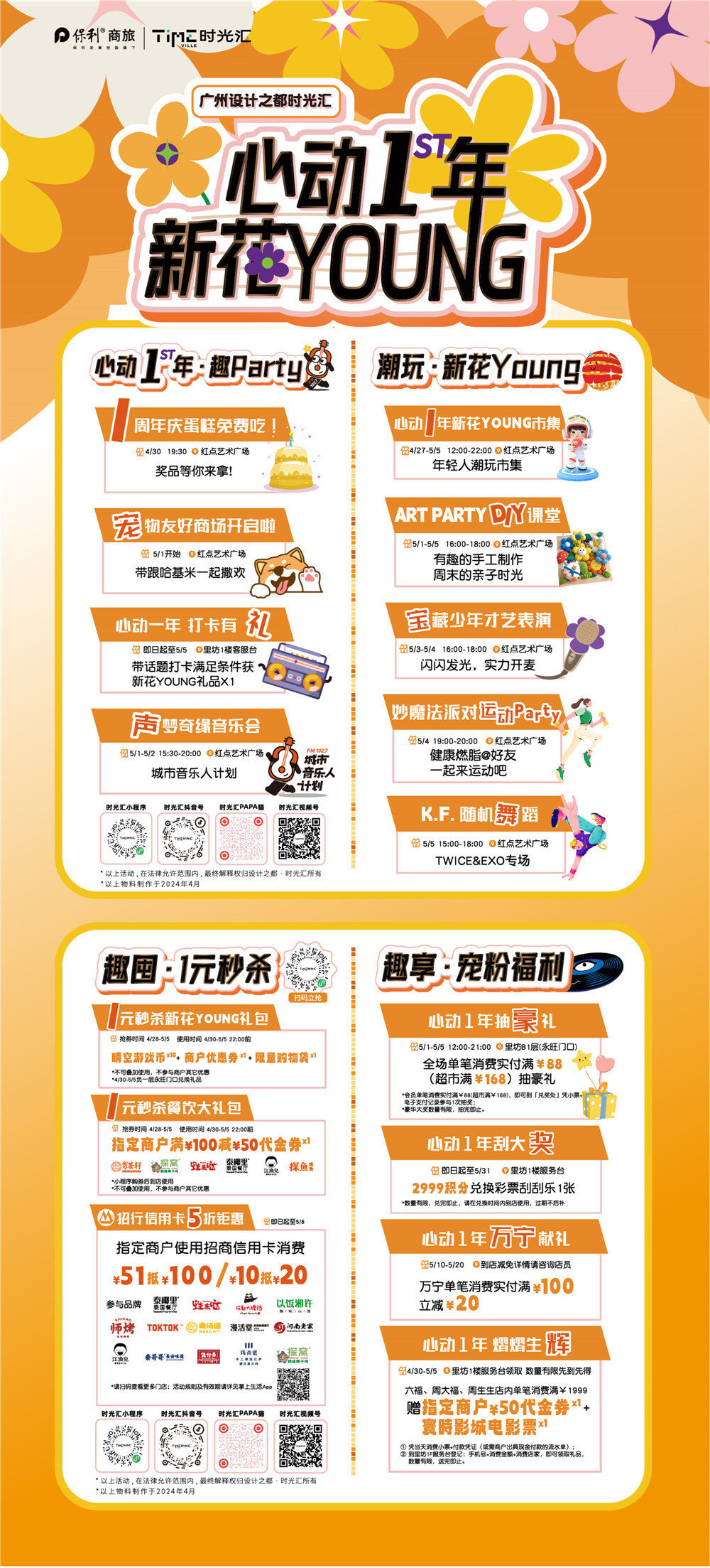 在开业一周年庆典之际,广州设计之都时光汇精心策划了“心动一年·新花Young”主题活动,从4月底开始便积极造势,准备为顾客带来一场难忘的节日盛宴。