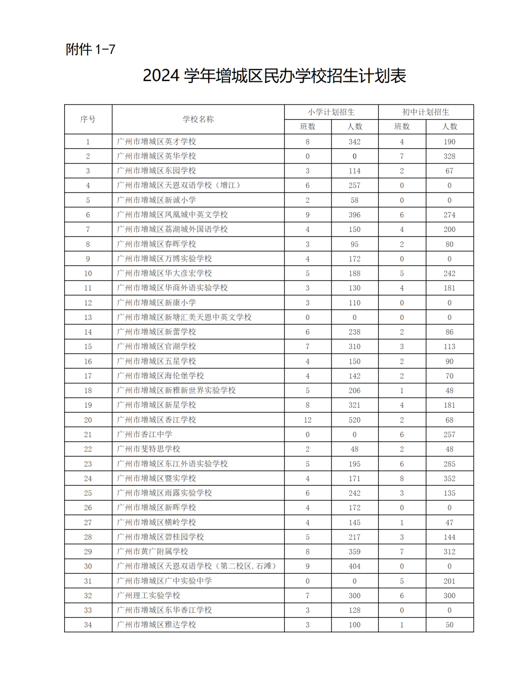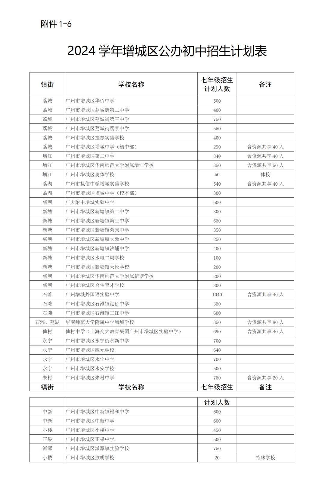 2024学年增城区公办初中招生计划表