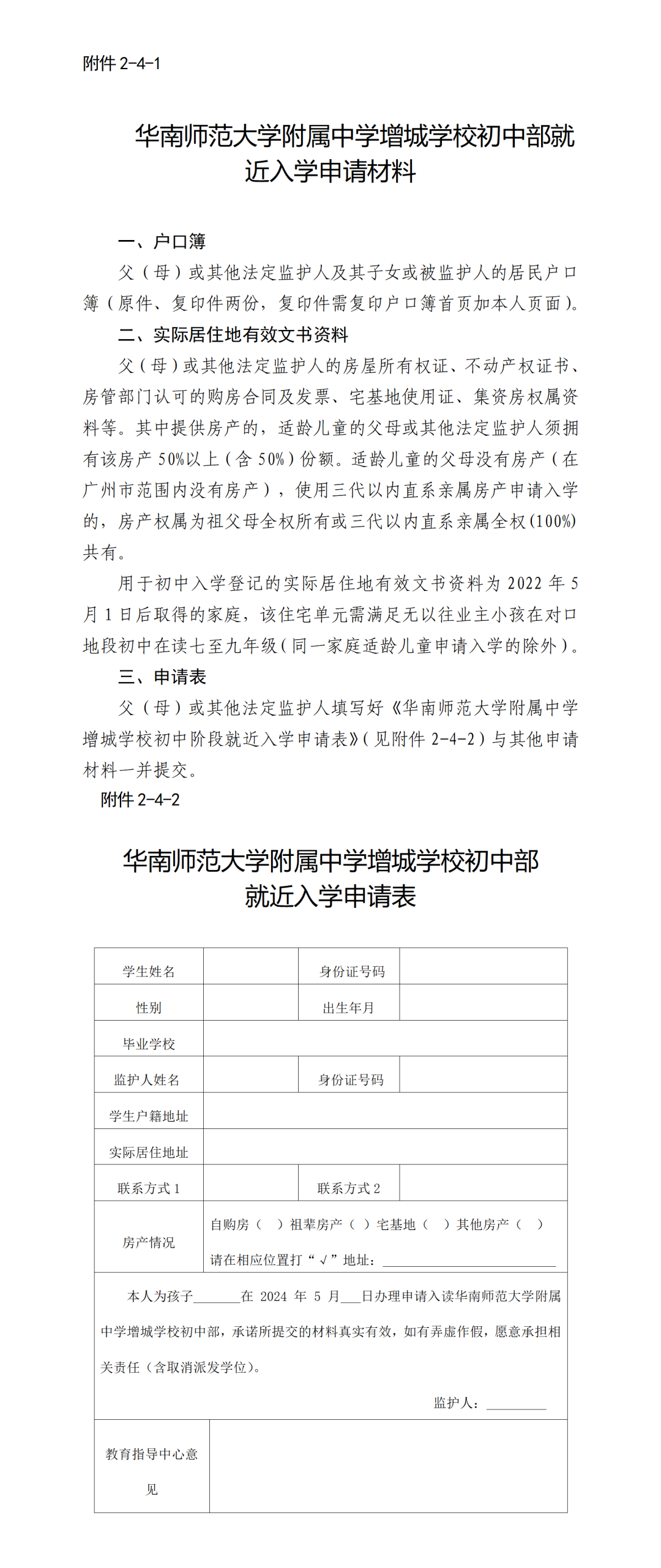 华附增城初中部就近入学申请材料及申请表