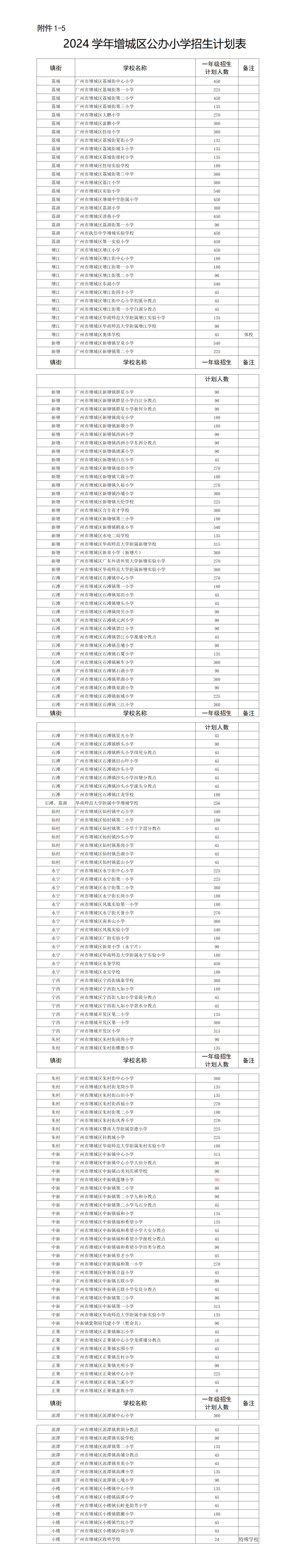 2024学年增城区公办小学招生计划表
