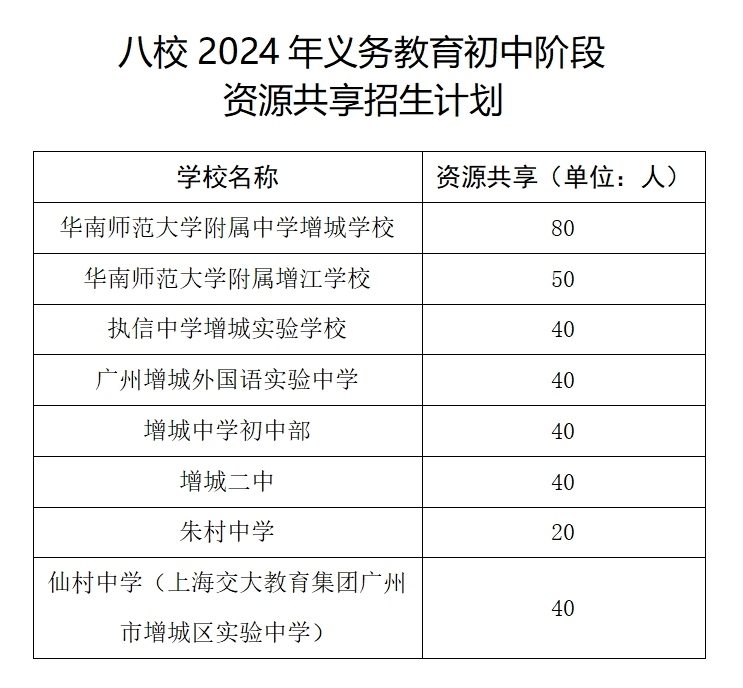 今年,华附增城、华南师范大学附属增江学校、执信中学增城实验学校、广州增城外国语实验中学、增城中学初中部、增城二中、朱村中学、仙村中学(上海交大教育集团广州市增城区实验中学)八所学校(以下简称“八校”)初中继续实行“就近入学”和“资源共享”两种招生方式。