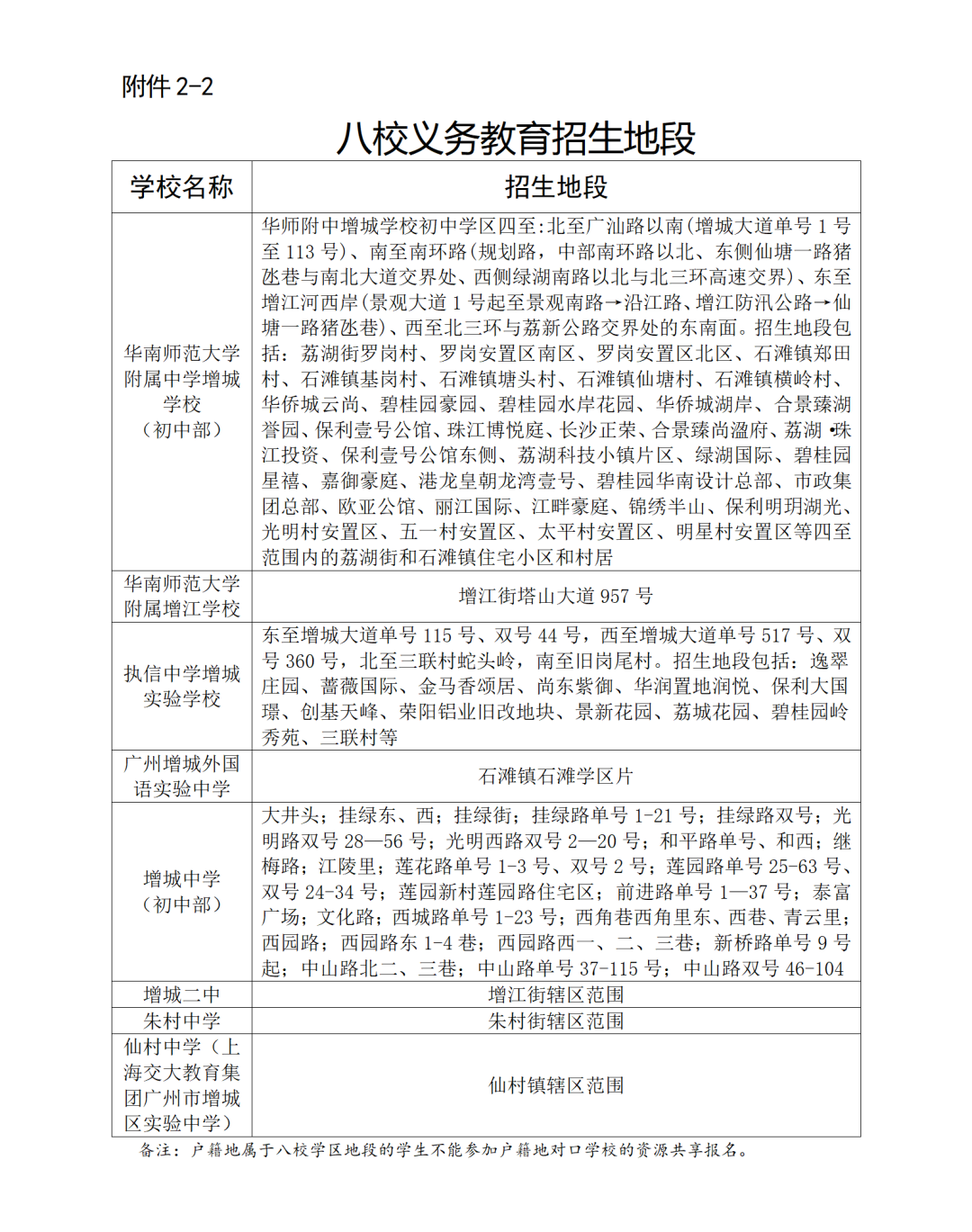 具有增城区户籍和学籍小学应届毕业生,但户籍地属于八校学区地段(见下图)的学生不在户籍地对口学校的资源共享对象范围内(例如:朱村户籍的毕业生不在朱村中学的资源共享对象范围内,但可以申请其他七校的资源共享学位)。