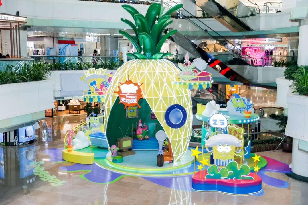 天河城北广场首次呈现超5米巨大的“沙堡”造型海绵宝宝半身像,仿佛刚刚被堆出来。椰树摇曳微风拂面,和派大星一起沉浸在明媚的日光浴场。步入天河城首层中庭,高达8.4米豪华菠萝屋在设计师的创意发挥下呈现出全新的样貌,海绵宝宝、派大星可爱睡衣造型首次亮相。