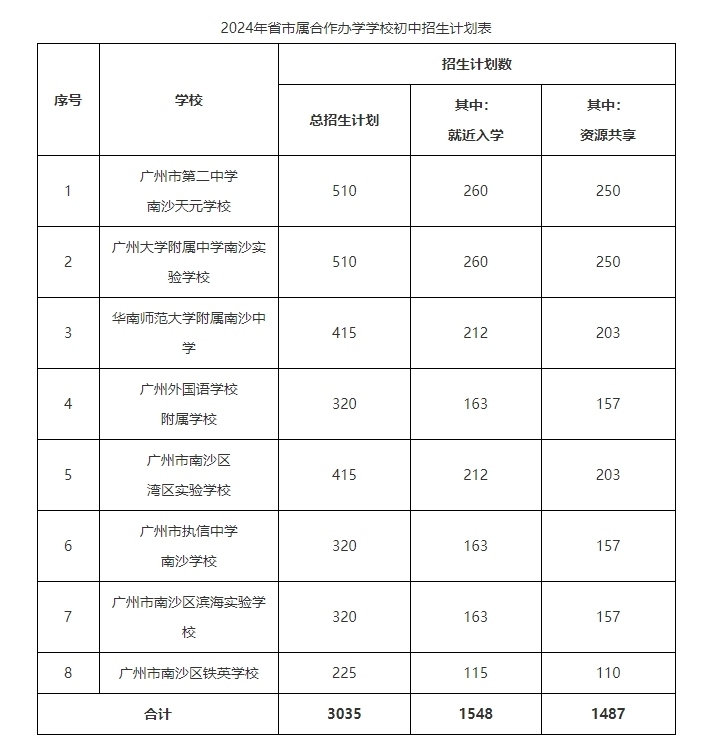 答:2024年,华南师范大学附属南沙中学、广州市南沙区湾区实验学校、广州市执信中学南沙学校、广州市第二中学南沙天元学校、广州大学附属中学南沙实验学校、广州外国语学校附属学校、广州市南沙区滨海实验学校和广州市南沙区铁英学校(以下简称“合作办学学校”)初中继续面向南沙全区资源共享招生,按照当年招生计划的51%就近入学、49%资源共享,招收具有广州市南沙区户籍和学籍的小学应届毕业生,使得每一个南沙学生都有通过电脑派位入读优质学校的机会。