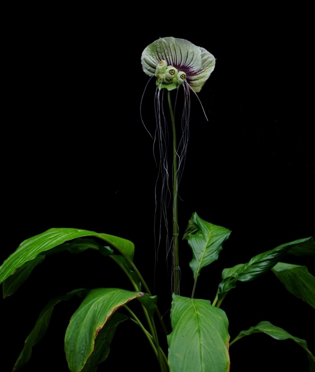 扇苞蒟蒻薯是薯蓣科蒟蒻薯属的多年生草本植物,挺直的花葶顶端是它独特的花序:两枚硕大、绿白色的总苞片圆扇状,似扇动的贝壳,又似飞舞的蝶翼,总苞片中央放射状的紫黑色斑纹为其清新的气质增添了一丝神秘,背面还有两枚稍小的绿色外轮总苞片;细长下垂的银色“胡须”则是它的小苞片;真正的花朵是中央挂着的那一串绿白色的“小铃铛”,“小铃铛”花被片6枚,向后反卷,当中6枚酷似小米粒的嫩黄雄蕊。整个花序造型十分独特,似深海中飘动着长长触须的水母,又像身披银发、头戴簪花帽的神秘少女。
