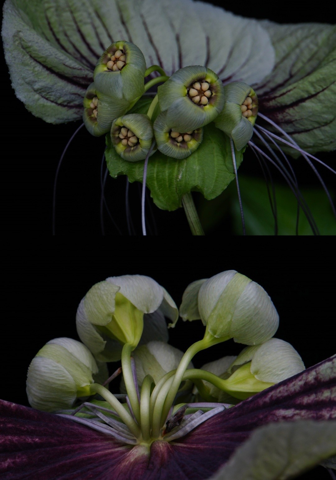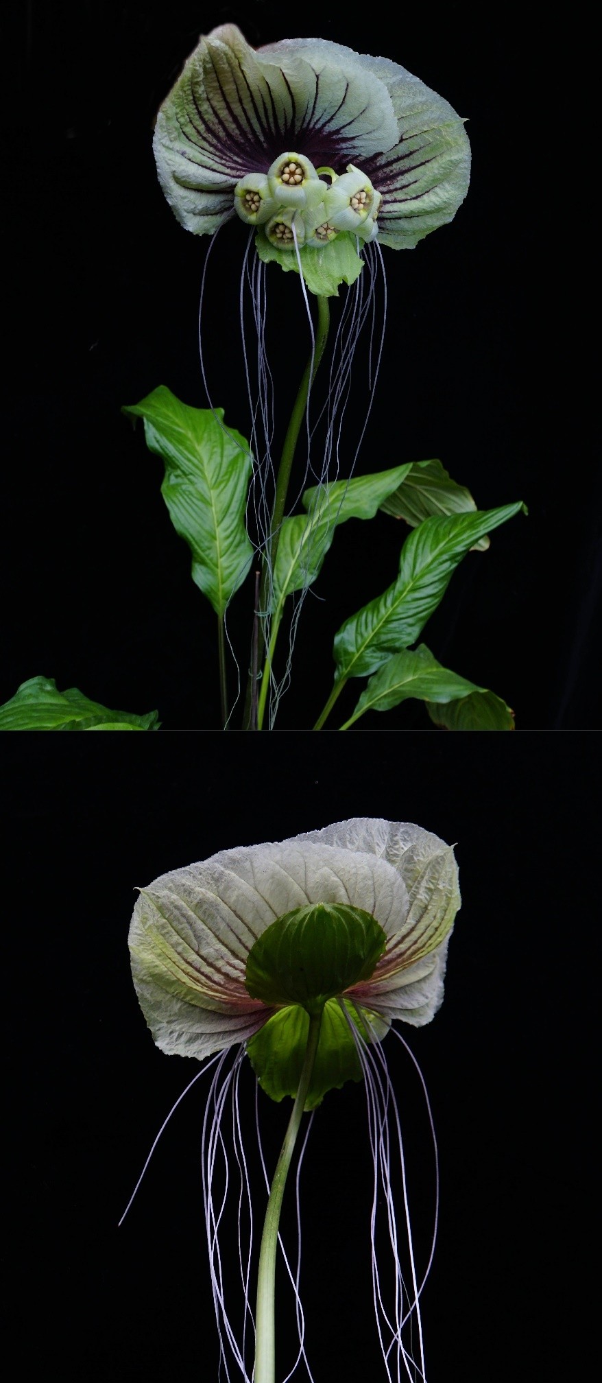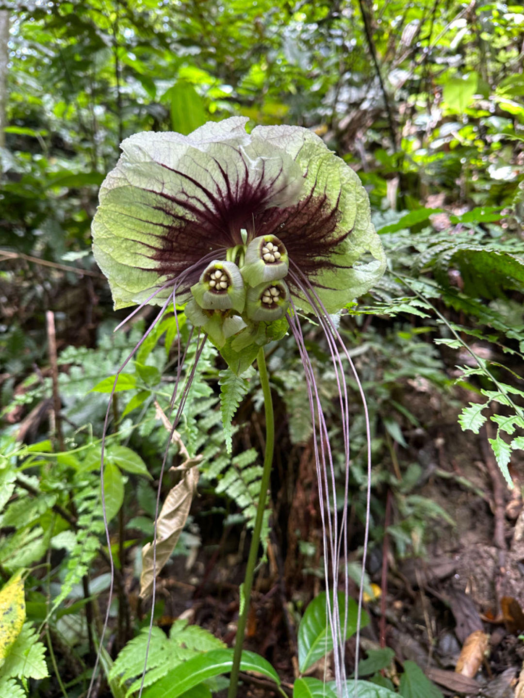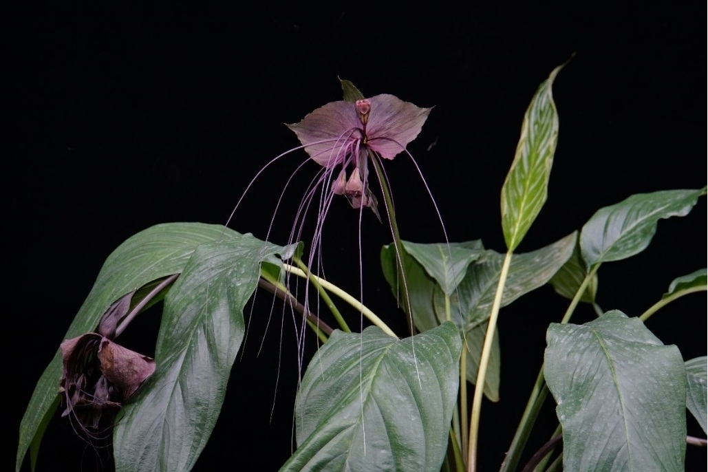 与扇苞蒟蒻薯同属的箭根薯也正值花期,它们都有硕大的总苞片和线形小苞片(“胡须”),只不过箭根薯的总苞片、小苞片和花朵都是紫黑色,自带神秘感,整个花序看上去就像一张龇牙咧嘴的老虎脸,细长下垂的小苞片状如虎须,因此箭根薯通常也被叫做老虎须。