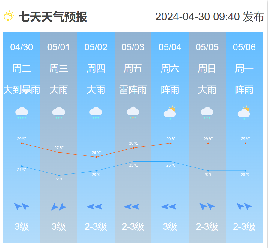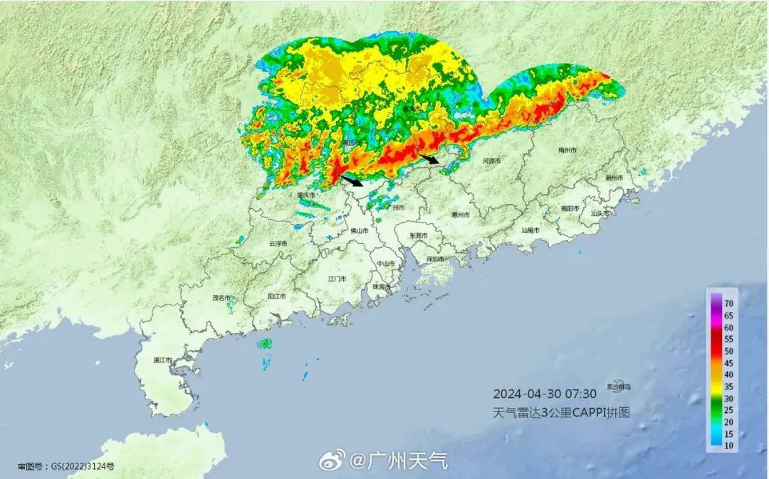 4月30日至“五一”假期广州市降雨频密,特别是4月30日,广州市有暴雨局部大暴雨,伴有9~11级短时大风、强雷电、局地冰雹等强对流天气。