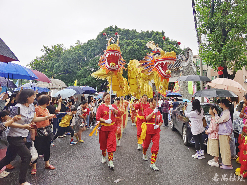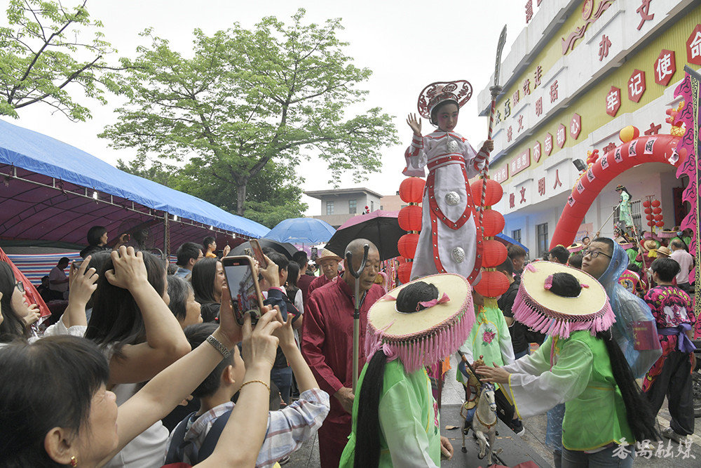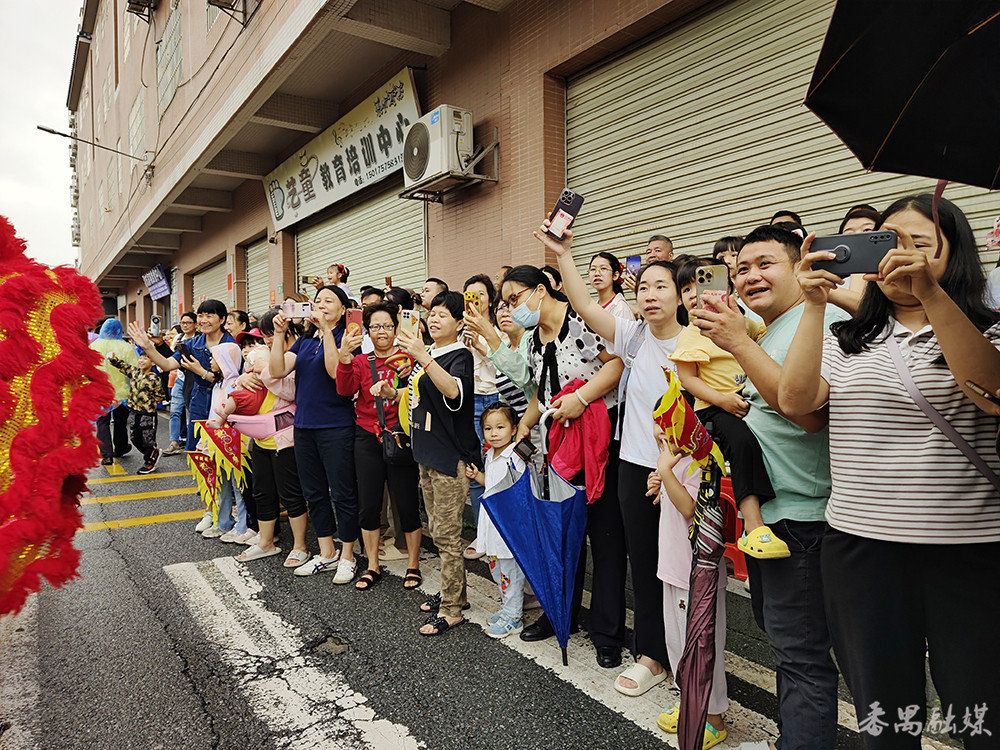 虽然现场天公不作美,不时下起了阵雨,但完全没有阻碍市民观赏飘色的热情。巡游路线沿途的大街小巷都站满了观看飘色的村民和周边市民,有的村民更是“担着凳仔”在家门口观看巡游表演。每当造型各异、凌空飘逸的“色仔””色女”经过,都会引来沿路市民的阵阵喝彩。很多街坊纷纷拿出手机拍下“色仔””色女”萌萌的样子,现场各种长枪短炮闪个不停。大家将所拍的视频和相片分享到朋友圈,现场就像一场盛大的“嘉年华”。
